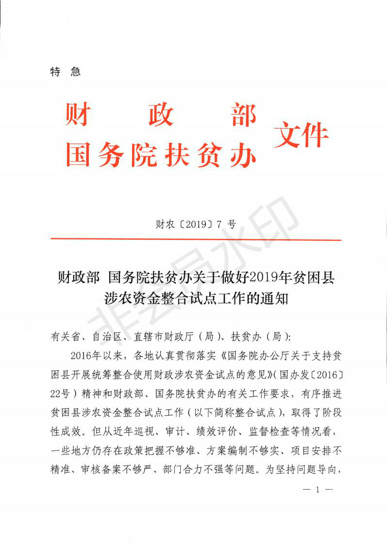 财政部 国务院扶贫办关于做好2019年贫困县涉农资金整合试点工作的通知