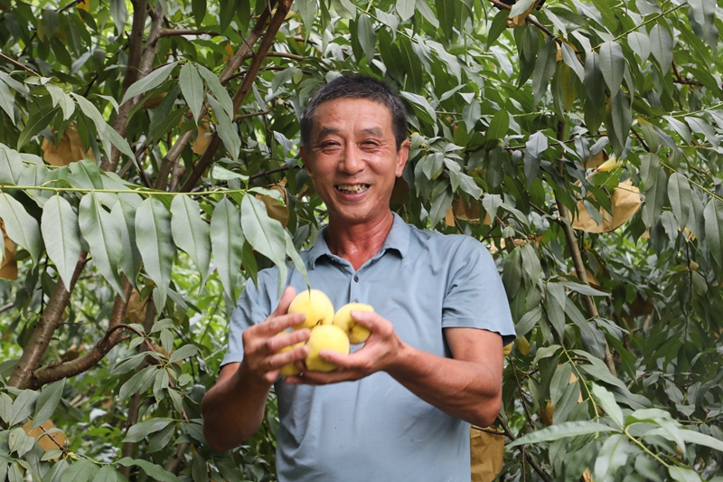 走进果农刘运生种植的黄桃园,一颗颗硕大饱满的黄桃挂满枝头,微风吹来,果香四溢,令人垂涎欲滴。刘运生正穿梭在桃林中,解开果袋,筛选采摘品相好、品质优的黄桃。