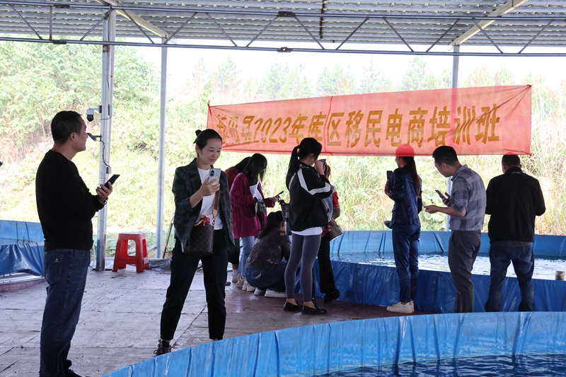走进湖南河溪渡生态农业发展有限公司,一群水利和库区移民们正在老师的指导下进行农产品直播,学员们手持设备,认真讲解新型绿色高效养鱼系统养殖技术圈养桶的特色,老师就如何直播带货、“三农”短视频拍摄技巧等内容进行答疑解惑,课堂互动十分活跃。