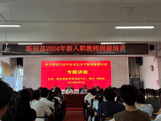 县教育局党组书记、局长邓振斌对参加典礼的嘉宾和学员表示了亲切的问候,并作《学习贯彻习近平总书记关于教育重要论述》专题讲座。他指出,新老师们赶上了好时代,随着科技和社会的进步,现在的生活比以往任何时候都更加便捷,新教师更要追上时代脚步,与时俱进,长远地进步。他要求,新老师们得到了好政策和发展的平台,如今国家智慧教学系统的建立,为新老师提供了更多更好的学习和展示的机会,请各位新教师务必珍惜。他强调,党的二十大提出“教育是党之大计,国之大计”,对教师队伍建设更加高度重视,我县在县委县、政府的大力支持下,全县教育人齐心协力打造了新田教育品牌,各类培训为一线教师发展创造了需对条件、提供了许多支持。他希望,新入职的老师们要乘上时代之风,虚心学习、踏实工作,成长为有情怀、有水平、有温度的好老师、大先生,为新田教育高质量发展添砖加瓦。