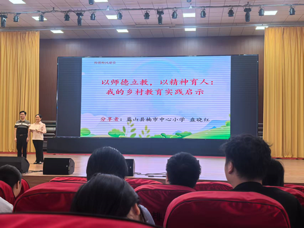 随后,全国模范教师、蓝山县楠市镇中心小学副校长盘晓红老师带来触动人心的师德演讲。她深情讲述扎根乡村的育人历程,分享自己收留孤儿、视如己出,用母爱与责任为孩子们撑起一片天的故事。盘晓红老师用实际行动诠释了“立德树人”的深刻内涵,其无私奉献的精神让在场教师热泪盈眶、深受鼓舞。