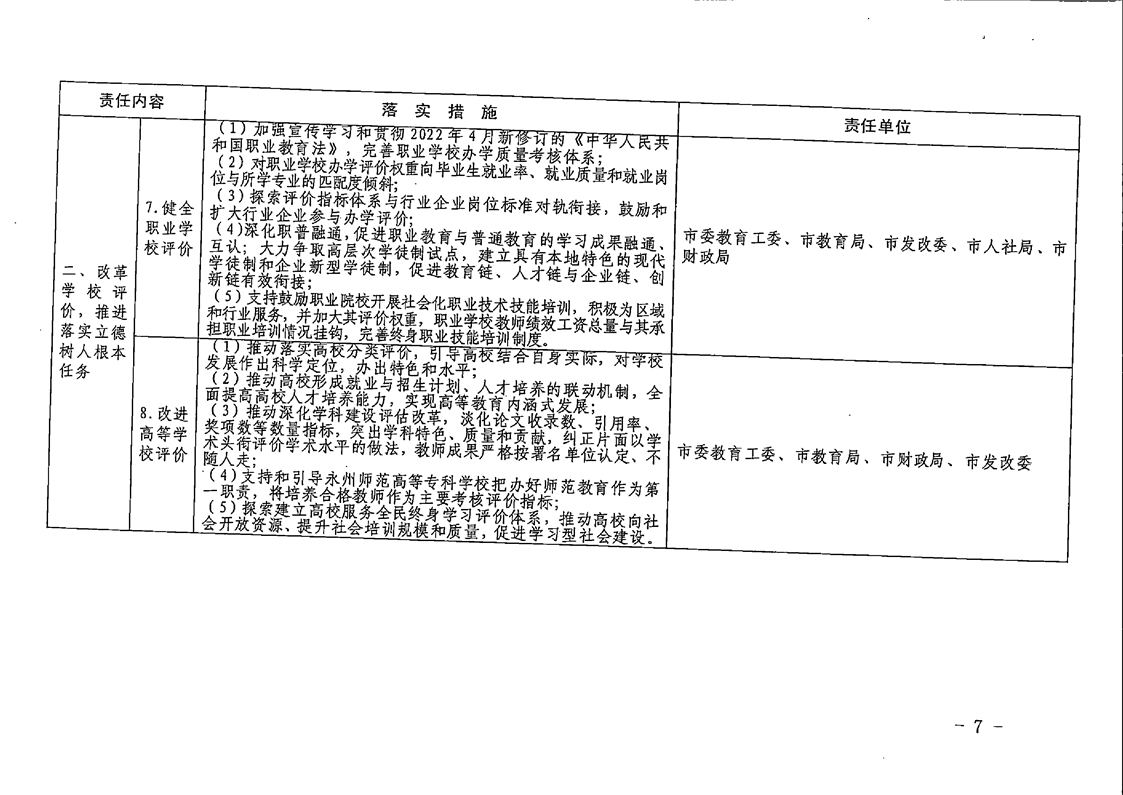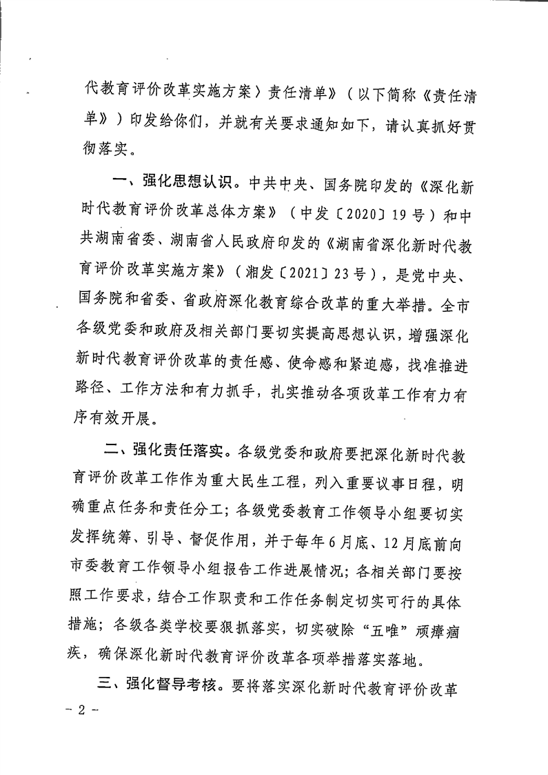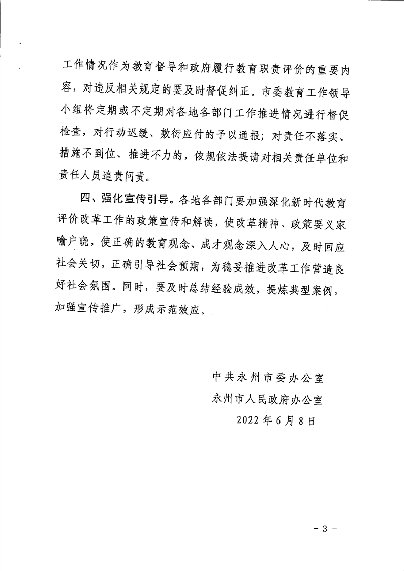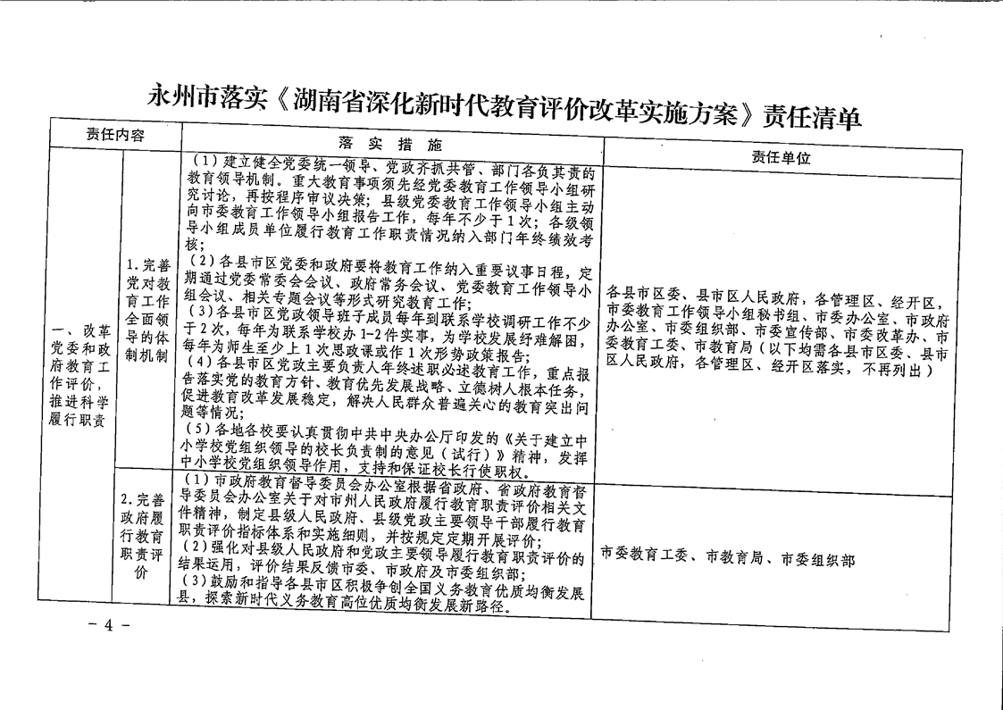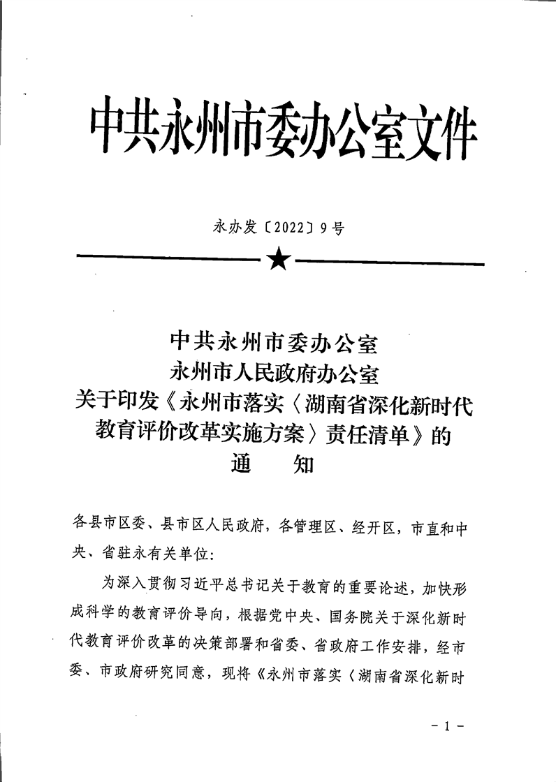 中共永州市委办公室关于印发《永州市落实湖南省深化新时代教育评价改革实施方案责任清单》的通知