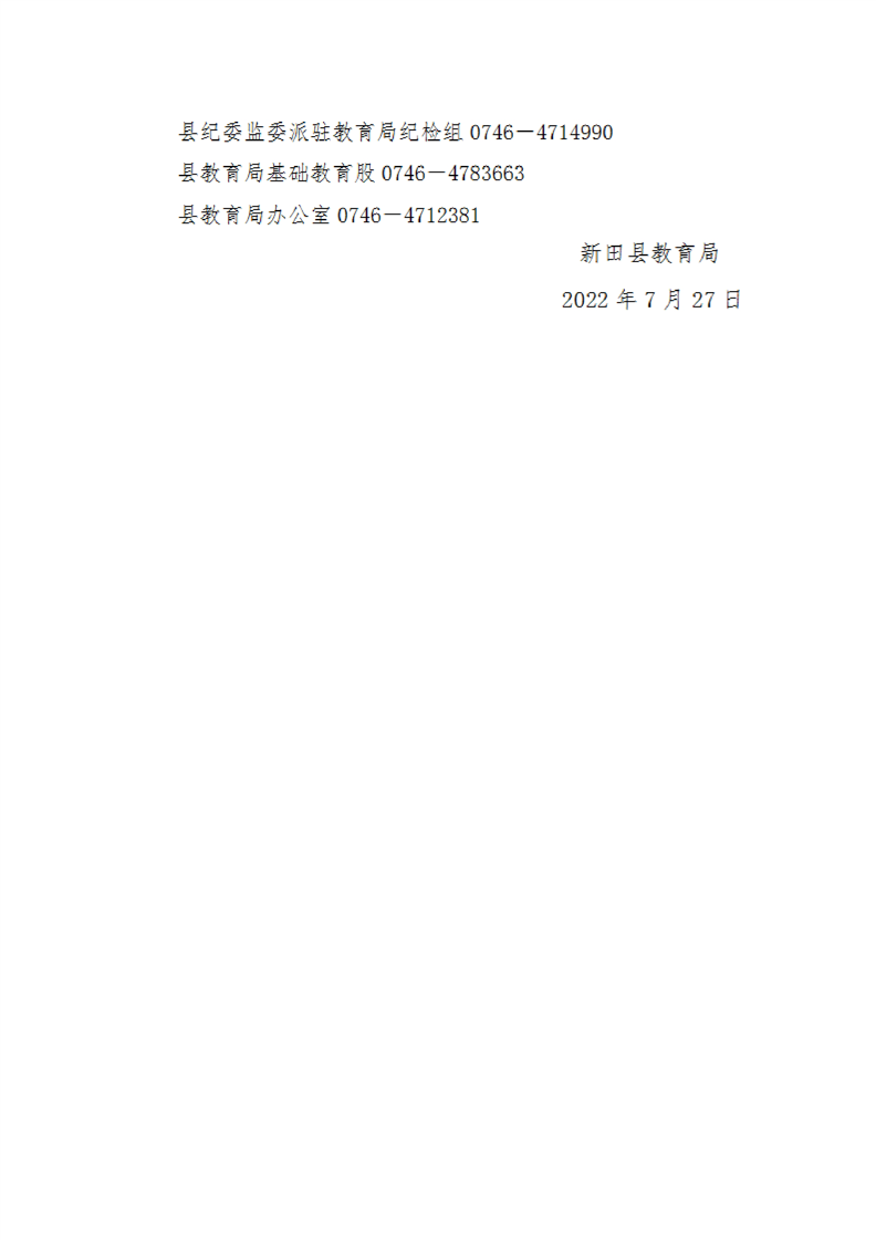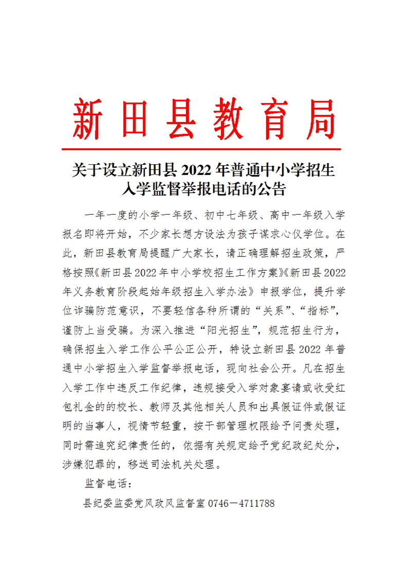 关于设立新田县2022年普通中小学招生入学监督举报电话的公告