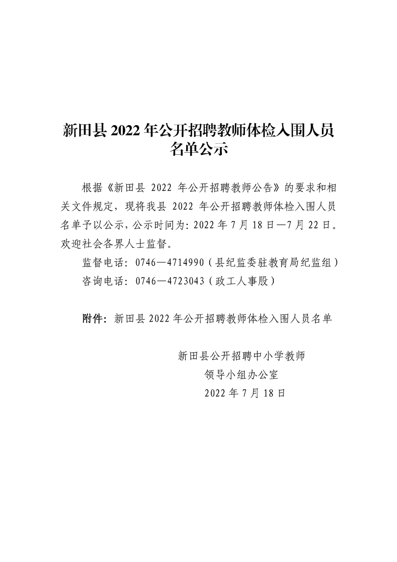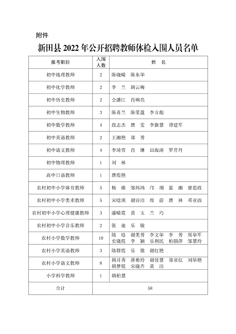 新田县2022年公开招聘教师体检入围人员名单公示