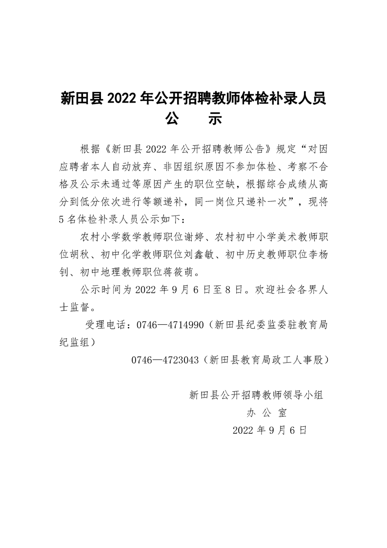 关于新田县2022年公开招聘教师体检递补人员的公示