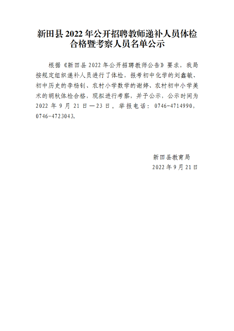 新田县2022年公开招聘教师递补人员体检合格暨考察人员名单公示