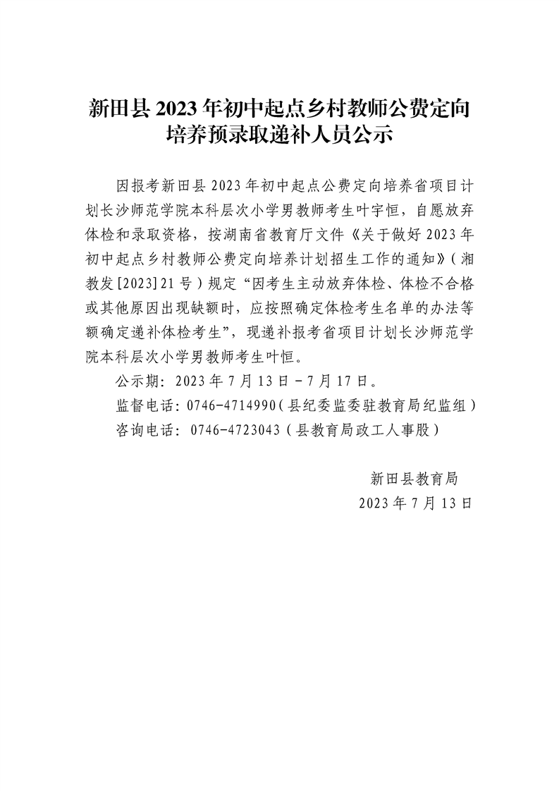 新田县2023年初中起点乡村教师公费定向培养预录取递补人员公示
