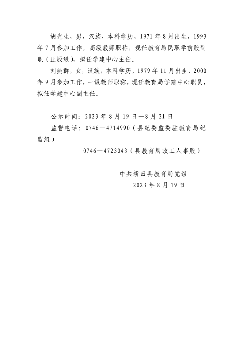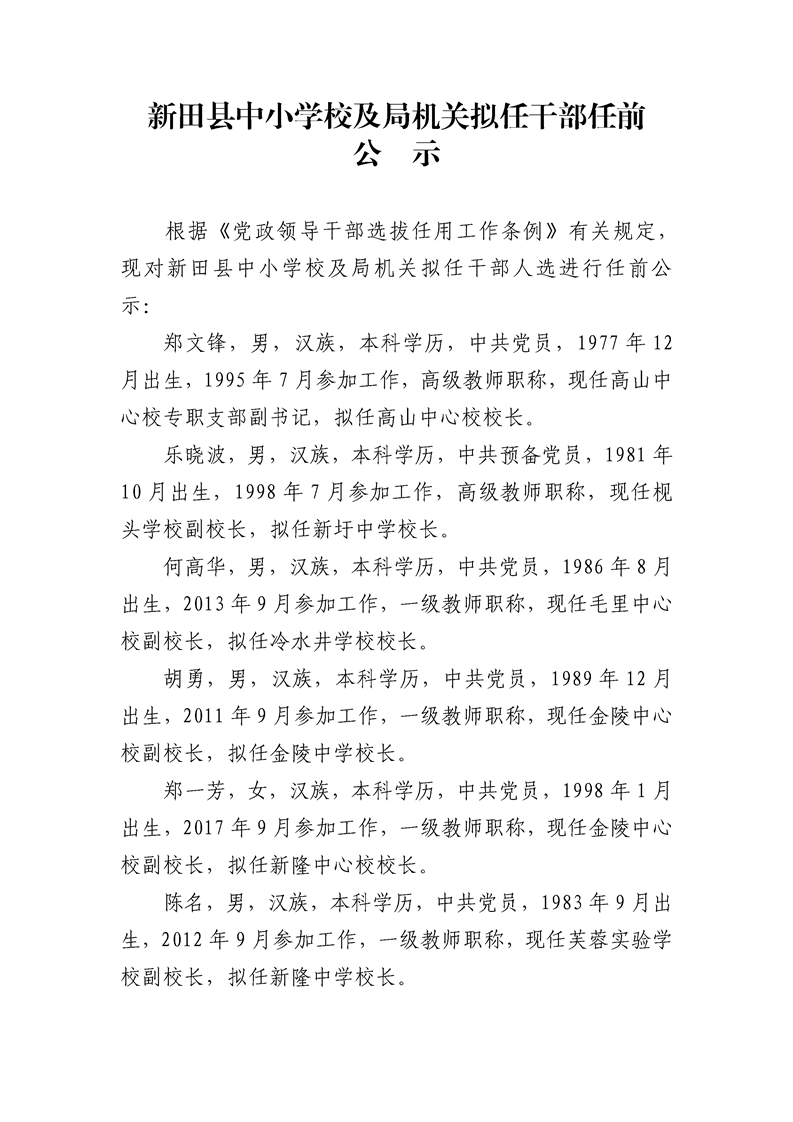新田县中小学校及局机关拟任干部任前公示