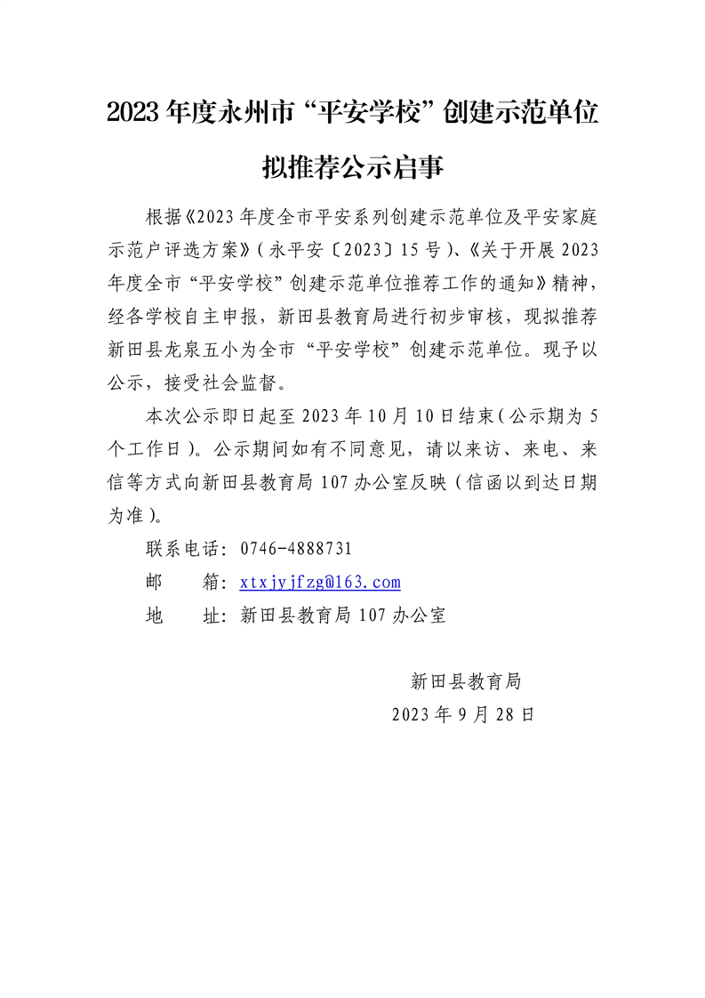 2023年度永州市“平安学校”创建示范单位拟推荐公示启事