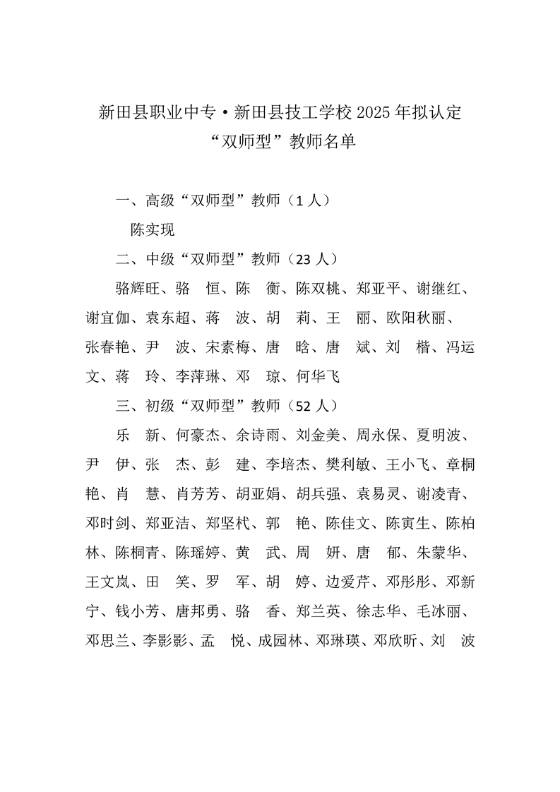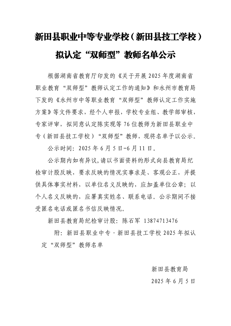 新田县职业中等专业学校(新田县技工学校)双师型教师认定名单公示