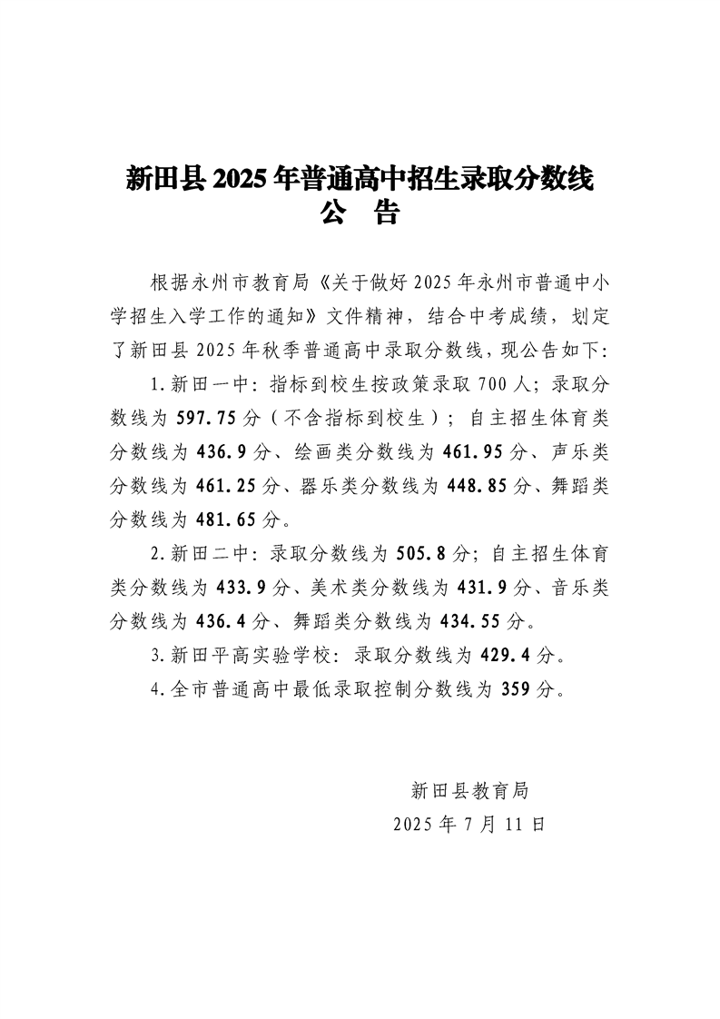 新田县2025年普通高中招生录取分数线公告