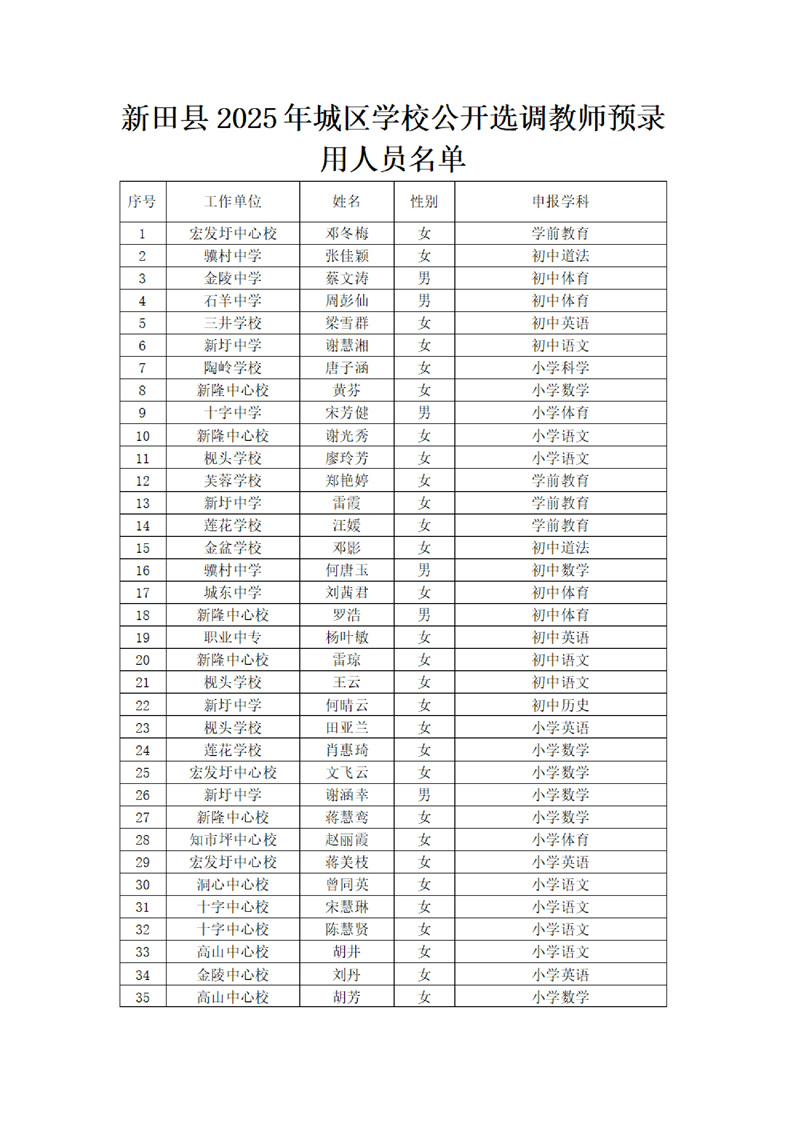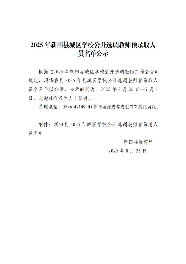 2025年新田县城区学校公开选调教师预录用人员名单公示
