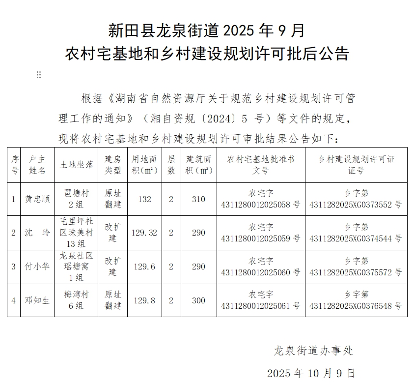新田县龙泉街道2025年9月农村宅基地和乡村建设规划许可批后公告