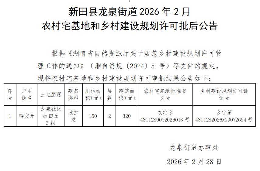 新田县龙泉街道2026年2月农村宅基地和乡村建设规划许可批后公告