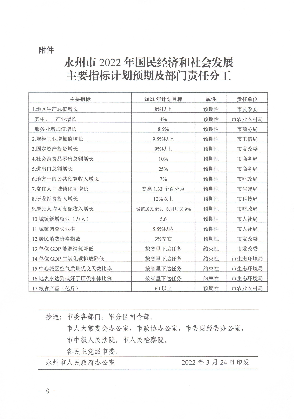 关于印发《永州市2022年国民经济和社会发展计划》的通知