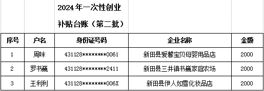依据永州市人民政府关于印发《永州进一步促进就业工作二十三条措施》的通知第四条,现将2024年一次性创业补贴(第二批)人员名单(见附件)公示,公示期7天 ,如有异议请向新田县就业服务中心等相关部门反映情况。