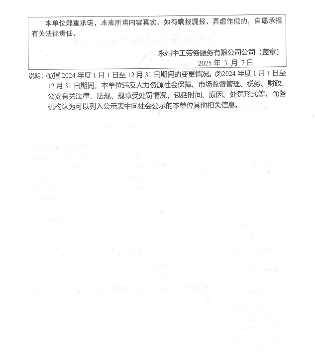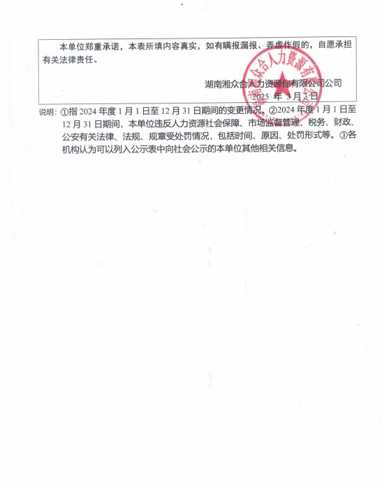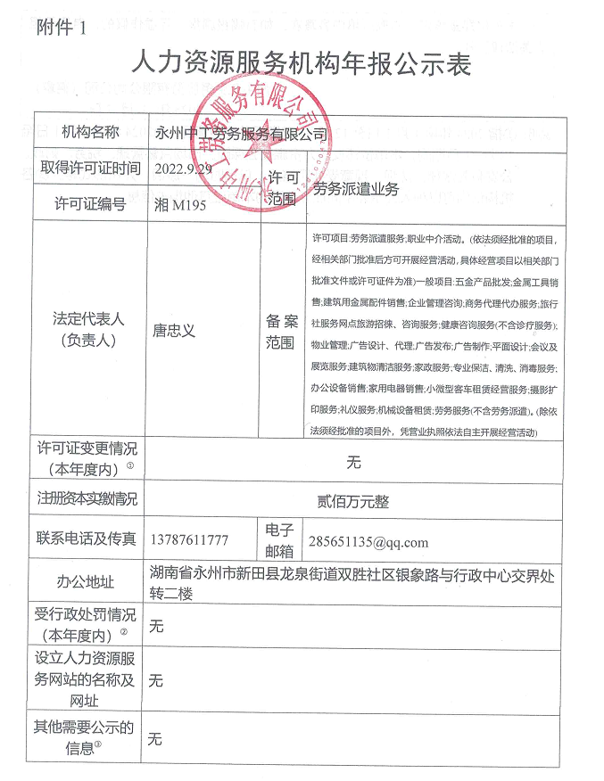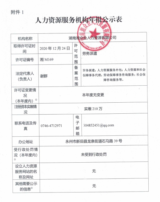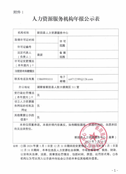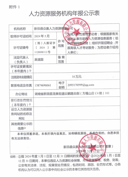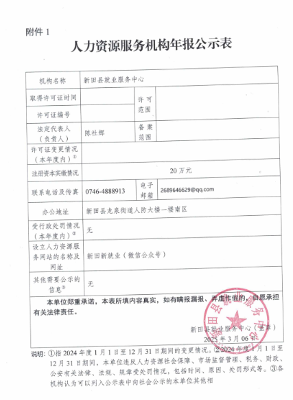根据省、市《关于做好2024年度人力资源服务机构年度报告公示工作的通知》有关规定,经及时通知、认真审核、沟通协调等程序,现将新田县人力资源服务中心、新田县就业服务中心、新田县众赢人力资源有限公司、湖南湘众合人力资源有限公司、永州中工劳务服务有限公司等五家人力资源服务机构年报公示表及年度报告相关情况加以公示,详情见附表。