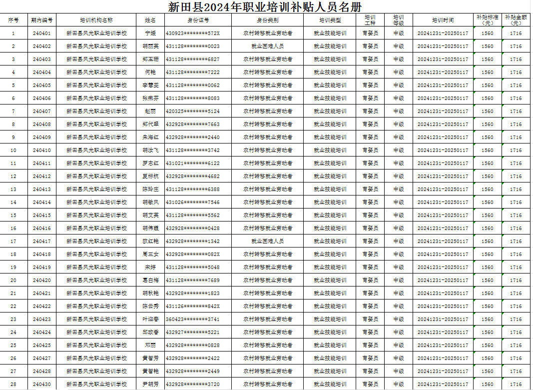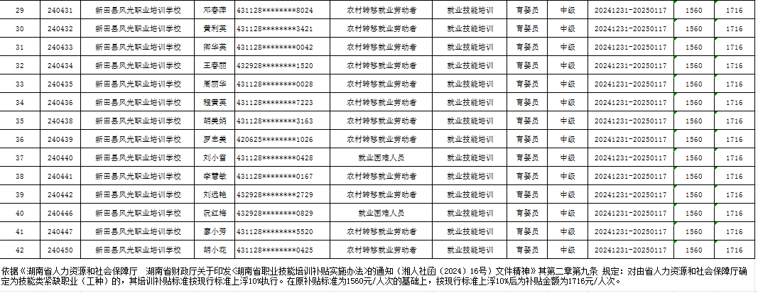 根据湖南省人社厅与财政厅的联合通知《湖南省职业技能培训补贴实施办法》(湘人社规〔2024〕16号)等文件的有关规定,现将2024年新田县风光职业培训学校第二批(第4期)参加职业技能培训补贴人员名单予以公示,公示期7天。如有异议请向新田县人力资源和社会保障局就业促进与失业保险股、新田县财政局社保股等相关部门反映情况。公示期满无异议,补贴资金将按规定程序拨付。