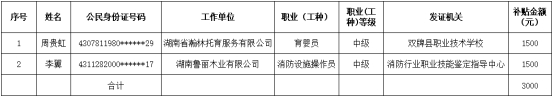 根据关于印发《湖南省失业保险参保职工技能提升补贴实施办法》湘人社发【2017】50 号的通知,经县就业服务中心审批通过,我县周贵虹等2人符合领取技能提升补贴,现对相关情况予以公示。
