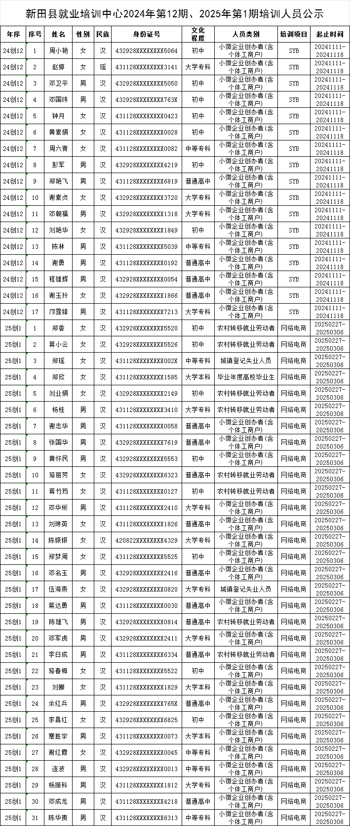 根据《湖南省人力资源和社会保障厅 湖南省财政厅关于印发<湖南省创业培训管理办法>的通知》(湘人社发[2015]26号)、<湖南省创业培训补充管理办法>的通知》(湘人社发[2018]47号)、《关于实施职业技能提升行动创业培训“马兰花计划”的通知》(湘人社函[2021]12号)文件的有关规定,现将新田县就业培训中心2024年第12期、2025年第1期参加创业培训人员名单公示,公示期7天,如有异议请向以下单位及部门反映情况,公示期满,补贴资金按规定程序拨付到位。