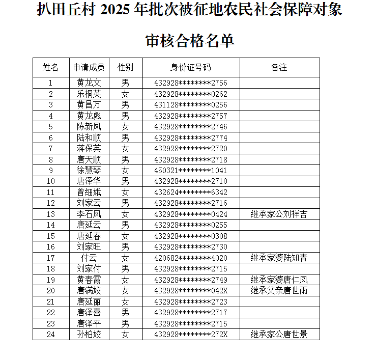 现将审查通过的24人名单予以公示,公示时间为:2025年2月19日至2025年2月25日,对不符合上述条件的人员,欢迎广大居民进行监督和举保,举报地点:新田县人力资源和社会保障局,举报电话:0746-4766727。我们将严格为举报人保密,并积极开展调查,调查属实的将取消被征地农民政府缴费补贴资格。