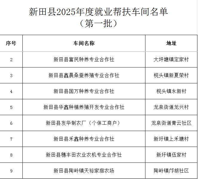 根据《巩固壮大就业帮扶车间促进就近就业的若干措施》(湘人社规〔2025〕3号)和《新田县巩固壮大就业帮扶车间促进就近就业的若干措施》(新人社联发〔2025〕6号)等文件精神,按照乡镇推荐的原则,经县财政局、县人社局、县农业农村局等部门联合实地调查核实,现拟认定新田县东旺农业发展有限公司、新田县富民种养专业合作社等9家企业(详细名单见附件)为新田县就业帮扶车间,特予公示。