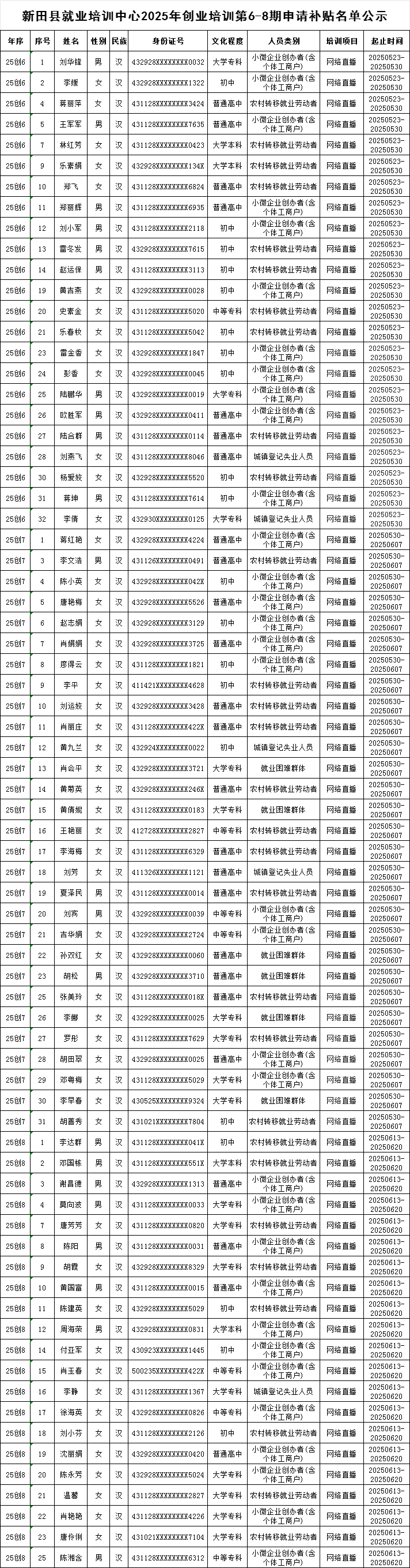 根据《湖南省人力资源和社会保障厅 湖南省财政厅关于印发<湖南省创业培训管理办法>的通知》(湘人社发[2015]26号)、<湖南省创业培训补充管理办法>的通知》(湘人社发[2018]47号)、《关于实施职业技能提升行动创业培训“马兰花计划”的通知》(湘人社函[2021]12号)文件的有关规定,现将新田县就业培训中心2025年第6-8期参加创业培训人员名单公示,公示期7天,如有异议请向以下单位及部门反映情况,公示期满,补贴资金按规定程序拨付到位。