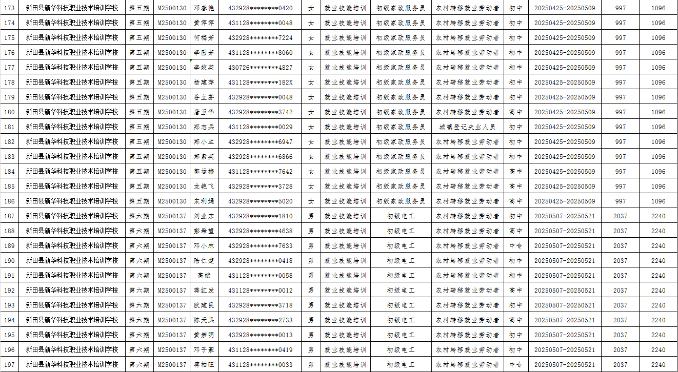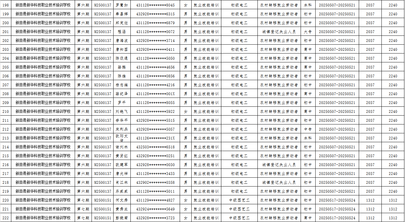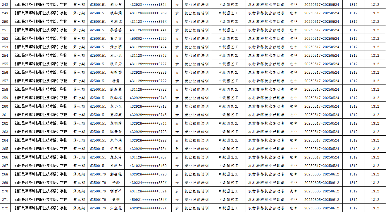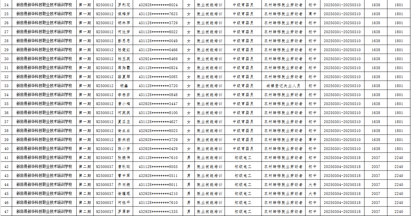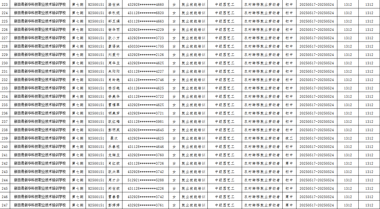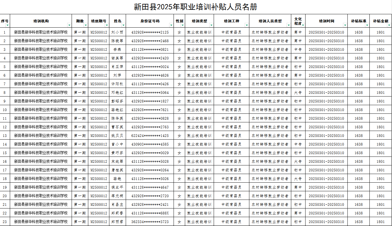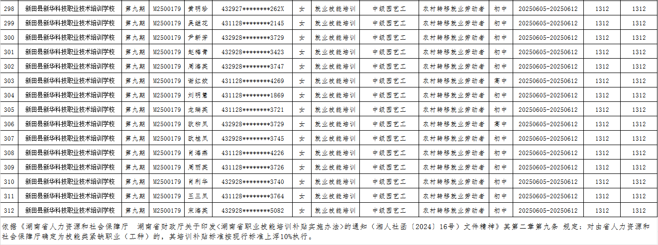 根据湖南省人力资源和社会保障厅 湖南省财政厅关于印发《湖南省职业技能培训补贴实施办法》(湘人社规〔2024〕16号)等文件的有关规定,现将2025年新田县新华科技职业技术培训学校(第1-7、9期)参加职业技能培训补贴人员名单予以公示,公示期7天。如有异议请向新田县人力资源和社会保障局就业促进与失业保险股、新田县财政局社保股等相关部门反映情况。公示期满无异议,补贴资金将按规定程序拨付。