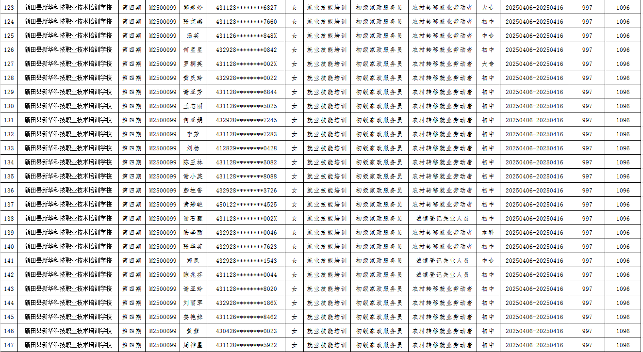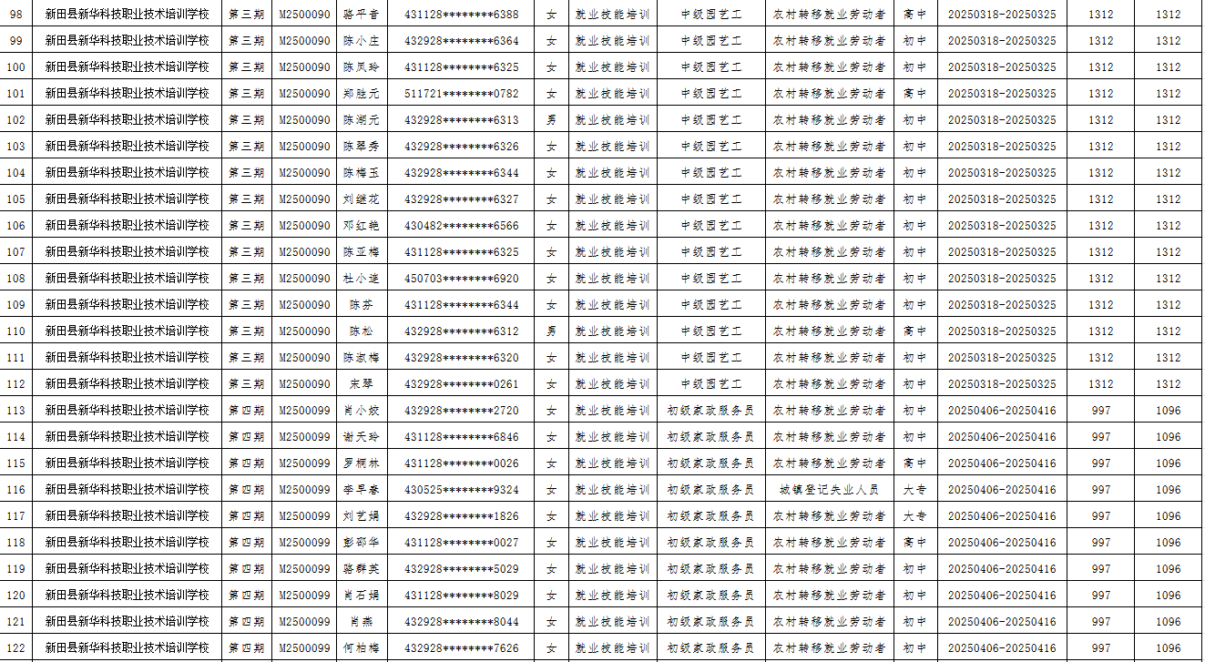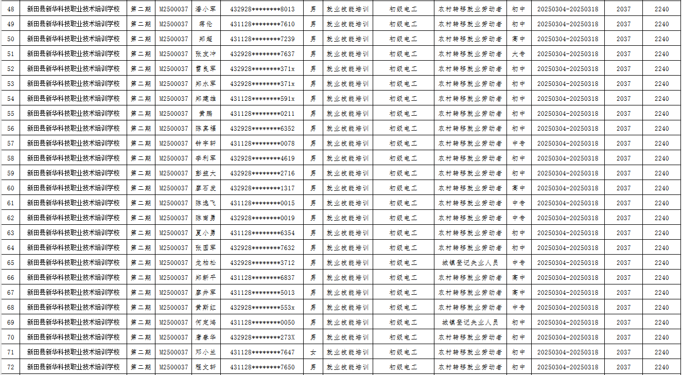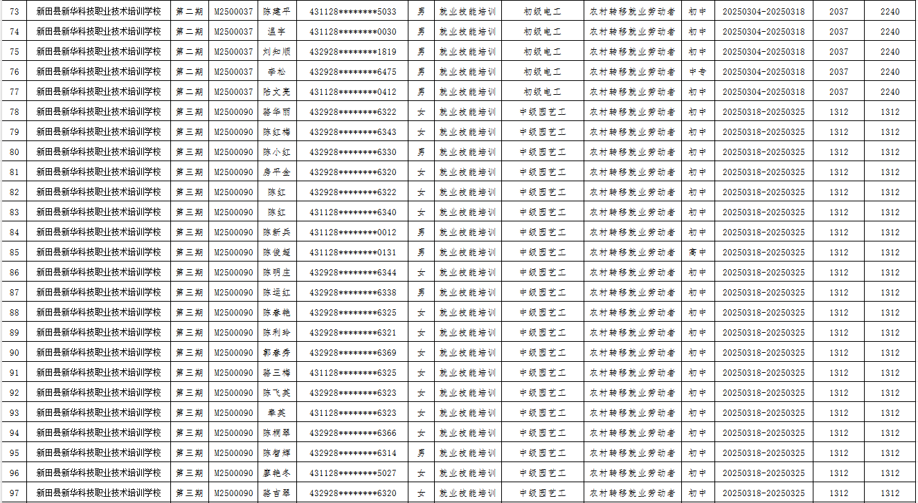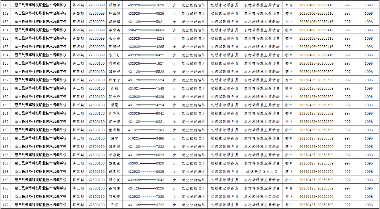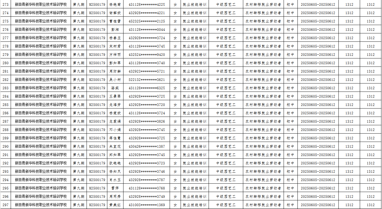 根据湖南省人力资源和社会保障厅 湖南省财政厅关于印发《湖南省职业技能培训补贴实施办法》(湘人社规〔2024〕16号)等文件的有关规定,现将2025年新田县新华科技职业技术培训学校(第1-7、9期)参加职业技能培训补贴人员名单予以公示,公示期7天。如有异议请向新田县人力资源和社会保障局就业促进与失业保险股、新田县财政局社保股等相关部门反映情况。公示期满无异议,补贴资金将按规定程序拨付。