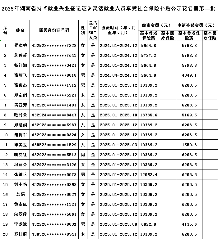根据湖南省人力资源和社会保障厅、湖南省财政厅湘人社规〔2020〕22 号,现将新田县2025年第二批灵活就业社保补贴人员名单(见附件)公示,公示期7天。如有异议请向新田县就业服务中心等相关部门反映情况。