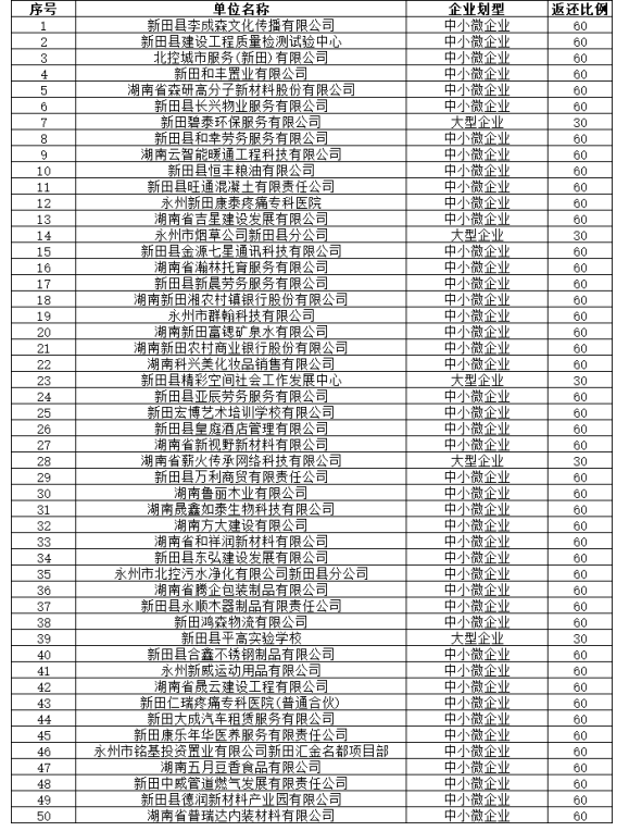 根据《湖南省人力资源和社会保障厅办公室关于进一步做好失业保险稳岗返还经办工作的通知》(湘人社办函〔2024〕37号)及《人力资源社会保障部 财政部 税务总局关于延续实施失业保险稳岗惠民政策措施的通知》(人社部发〔2025〕18号)文件精神,经审核,2025年度新田县第一批符合失业保险稳岗返还享受条件的单位共50家。现将50家享受稳岗返还单位名单公示,公示期为2025年8月22日至8月29日。如有异议,请于公示期内向新田县就业服务中心失业保险股反映。
