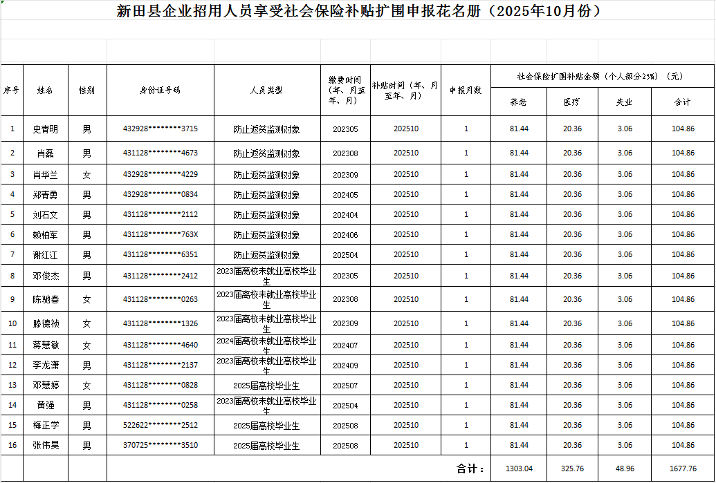 根据《关于落实社会保险补贴扩围政策有关事项的通知》,现将新田县2025年10月份企业社保扩围补贴人员名单(见附件)公示,公示期7天。如有异议请向新田县就业服务中心等相关部门反映情况。