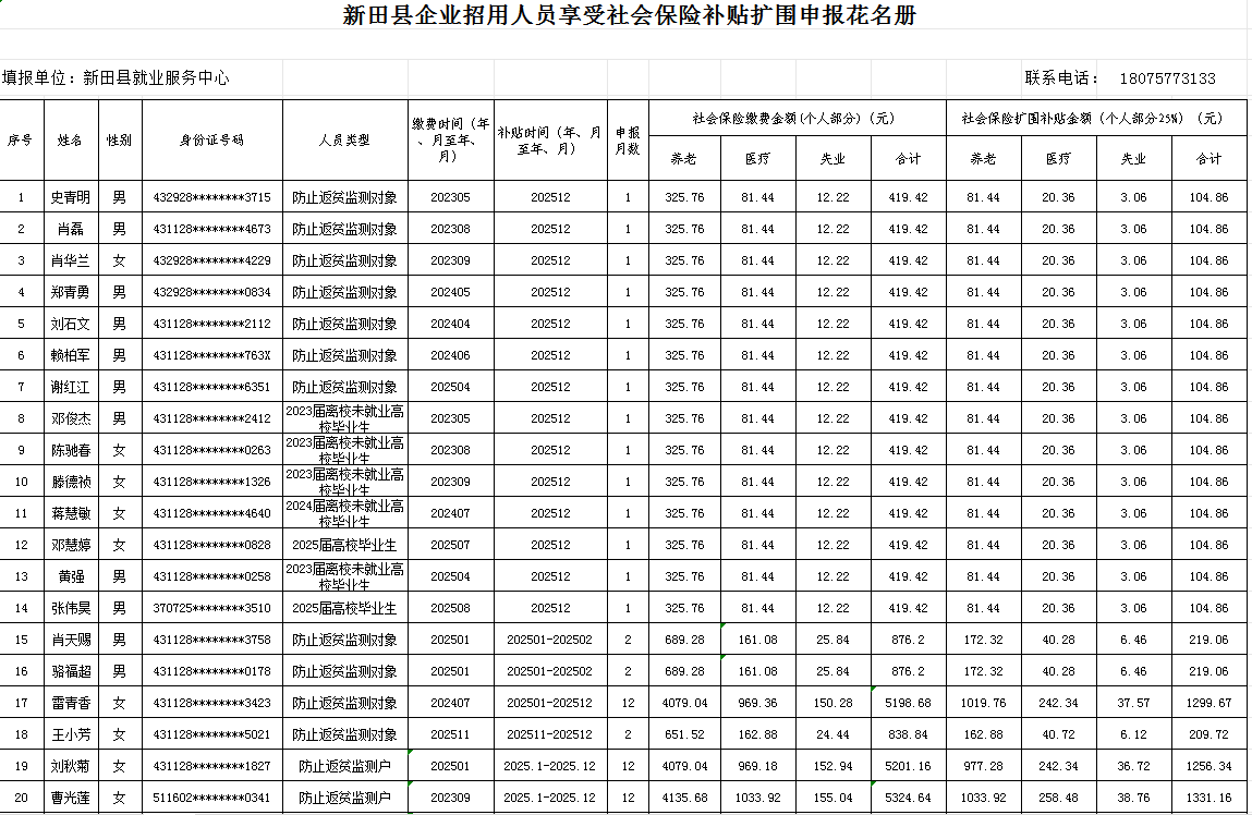 根据《关于落实社会保险补贴扩围政策有关事项的通知》,现将新田县2025年12月份企业社保扩围补贴人员名单(见附件)公示,公示期7天。如有异议请向新田县就业服务中心等相关部门反映情况。