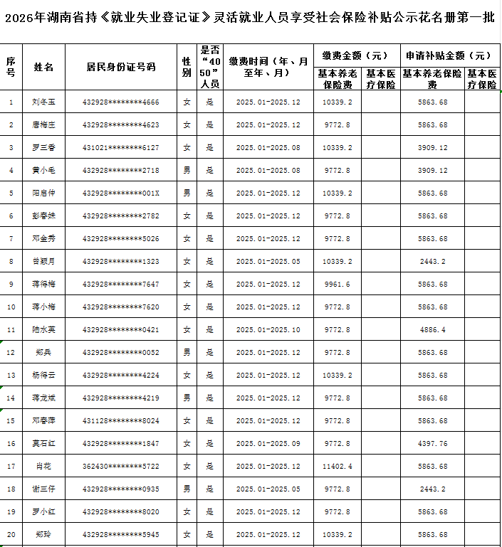 根据湖南省人力资源和社会保障厅、湖南省财政厅湘人社规〔2020〕22 号,现将新田县2026年第一批灵活就业社保补贴人员名单(见附件)公示,公示期7天。如有异议请向新田县就业服务中心等相关部门反映情况。