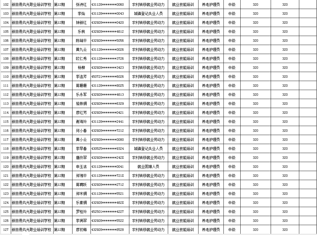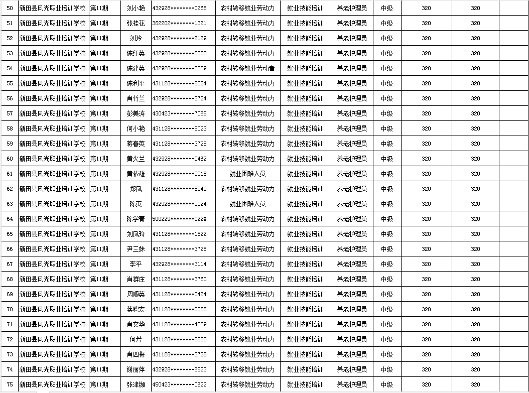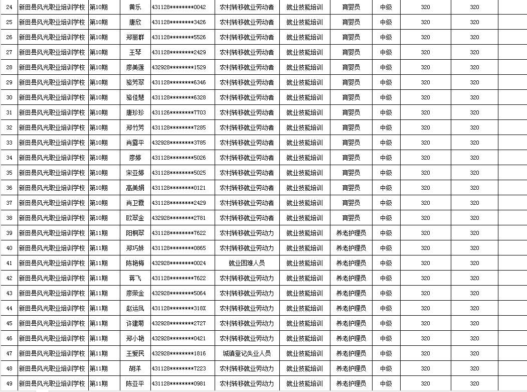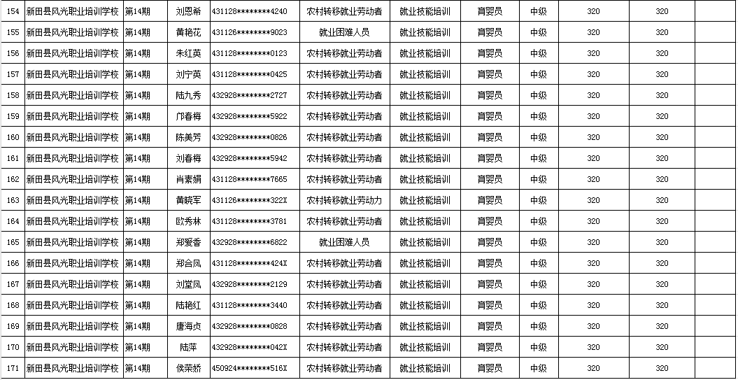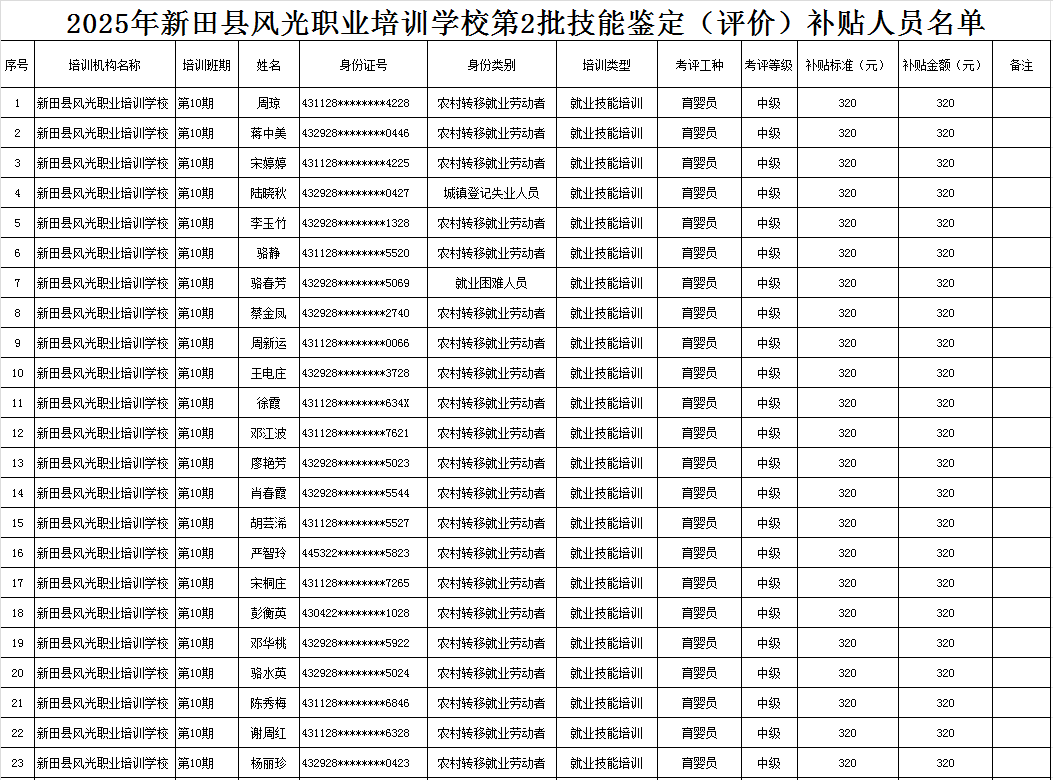 根据湖南省人社厅湖南省财政厅关于印发《湖南省职业技能培训补贴实施办法》的通知(湘人社规〔2024〕16号)、湖南省人社厅《关于公布我省职业技能鉴定收费标准的通知》(湘人社规〔2024〕3号)等文件的有关规定,现将2025年新田县风光职业培训学校第一批(第10、11、12、14期)职业技能鉴定(评价)补贴人员名单予以公示,公示期7天。如有异议请向新田县人社局就业促进与失业保险股等相关部门反映情况。公示期满无异议,补贴资金将按规定程序拨付到位。