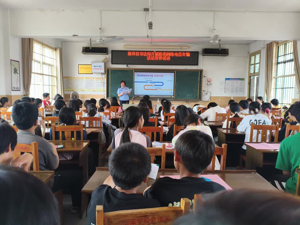 6月16日,新田县司法局在田家学校开展防范网络电信诈骗法治宣传活动,通过沉浸式普法教育,为学生筑牢反诈安全防线。