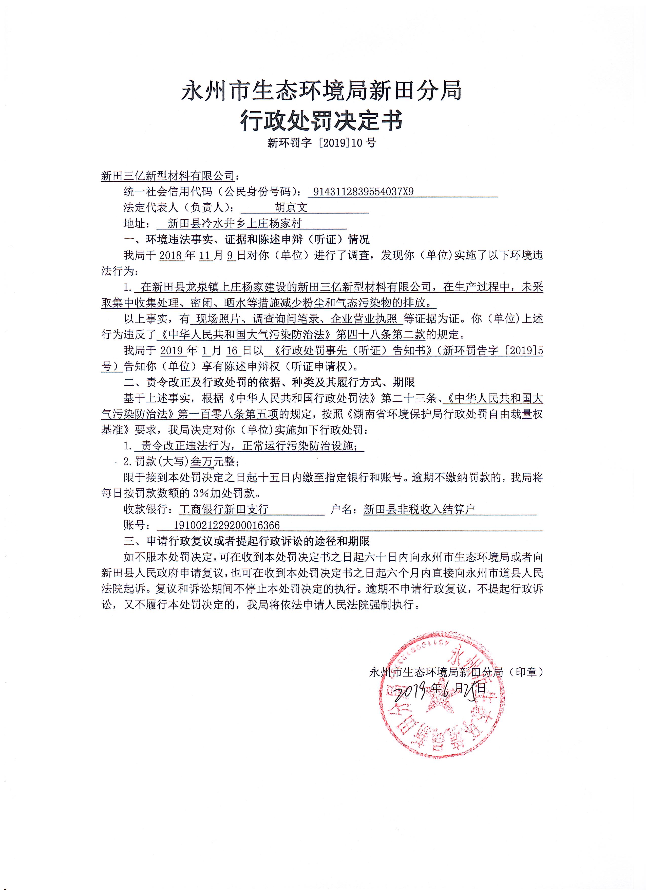 新环罚字【2019】10号关于新田县三亿新型材料有限公司行政处罚决定书
