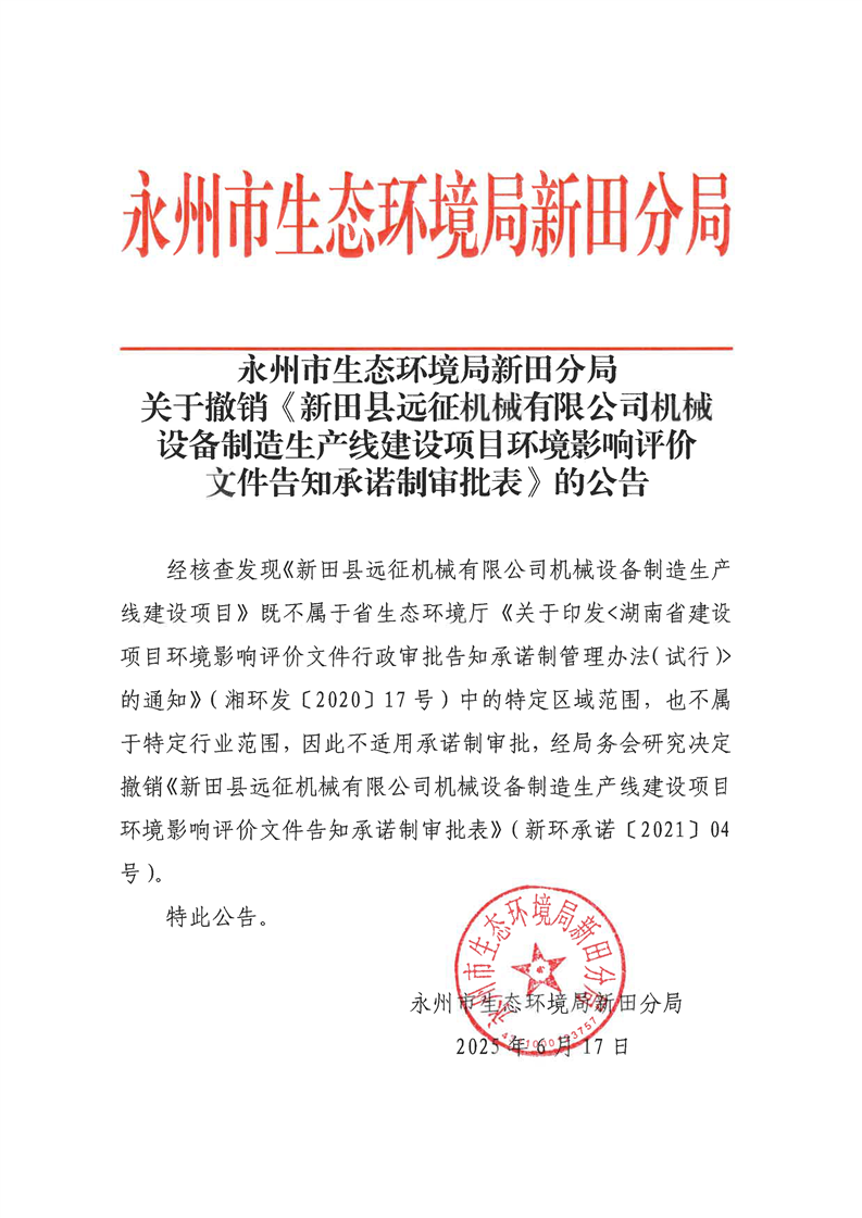 永州市生态环境局新田分局关于撤销《新田县远征机械有限公司机械设备制造生产线建设项目环境影响评价文件告知承诺制审批表》的公告