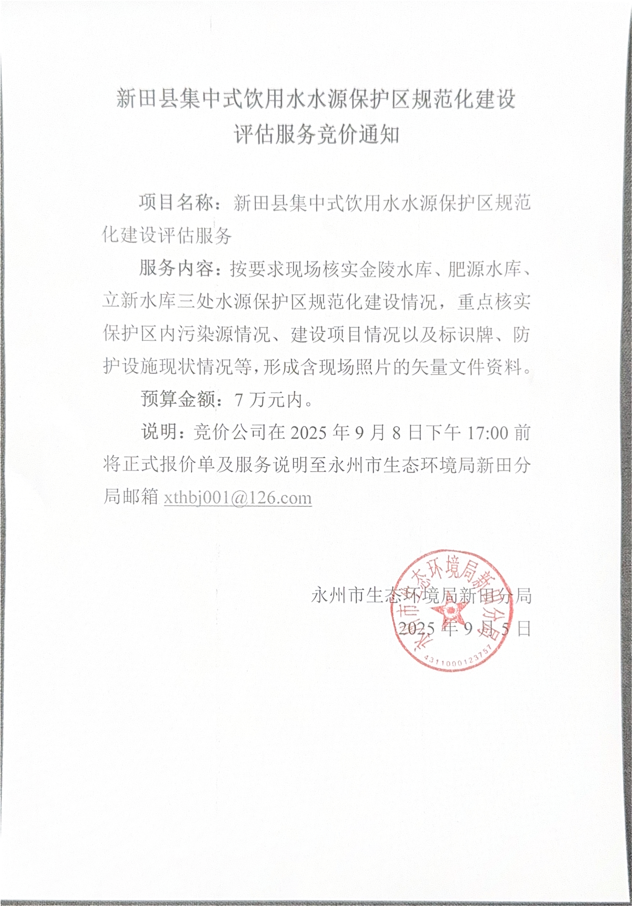 新田县2025年集中式饮用水水源保护区规范化建设评估工作服务竞价通知