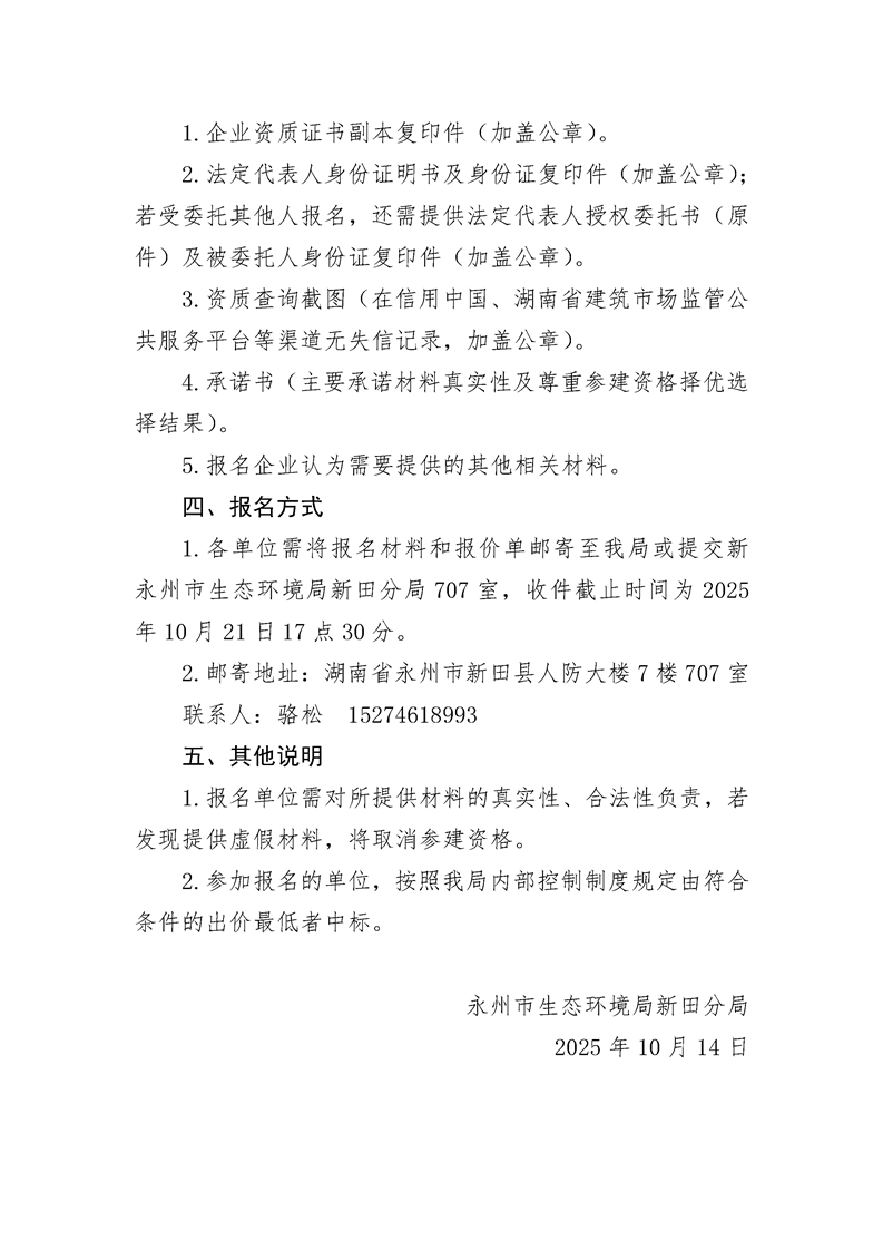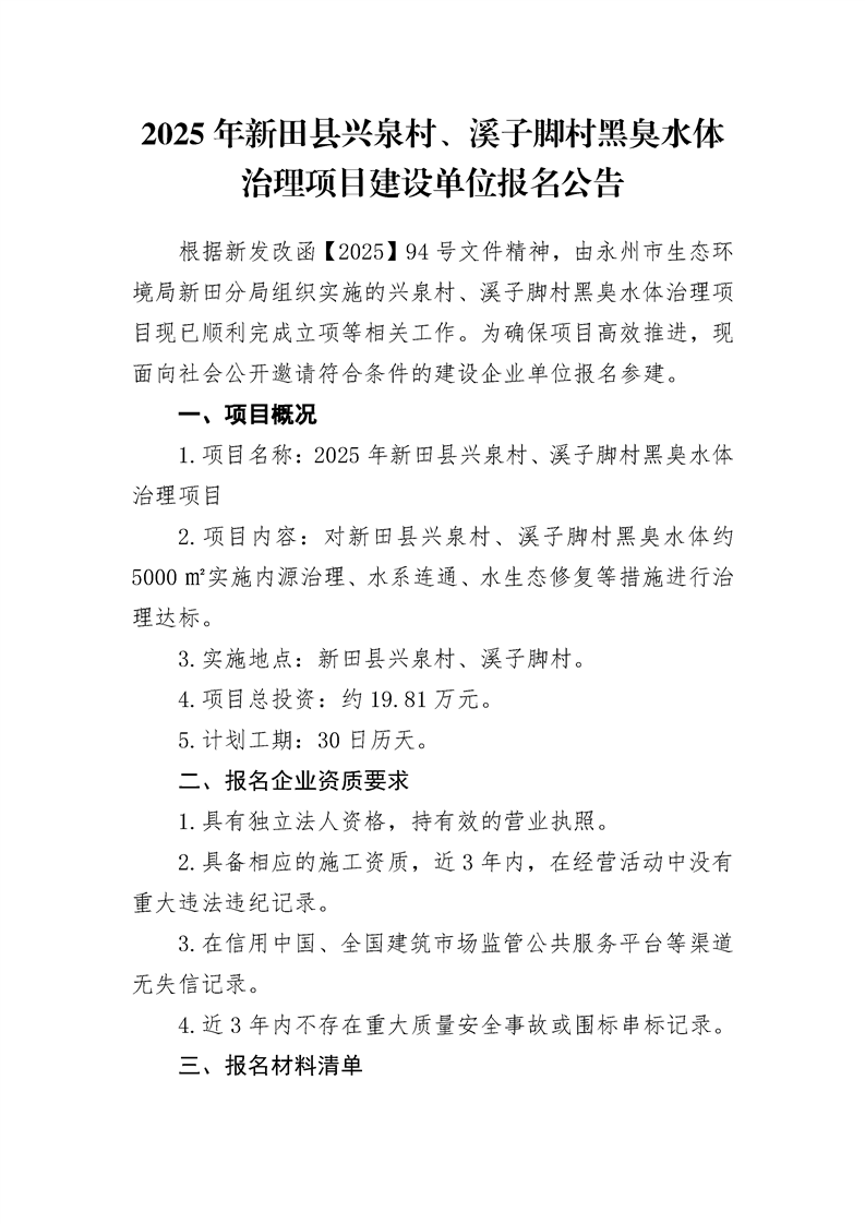 2025年新田县兴泉村、溪子脚村黑臭水体治理项目建设单位报名公告
