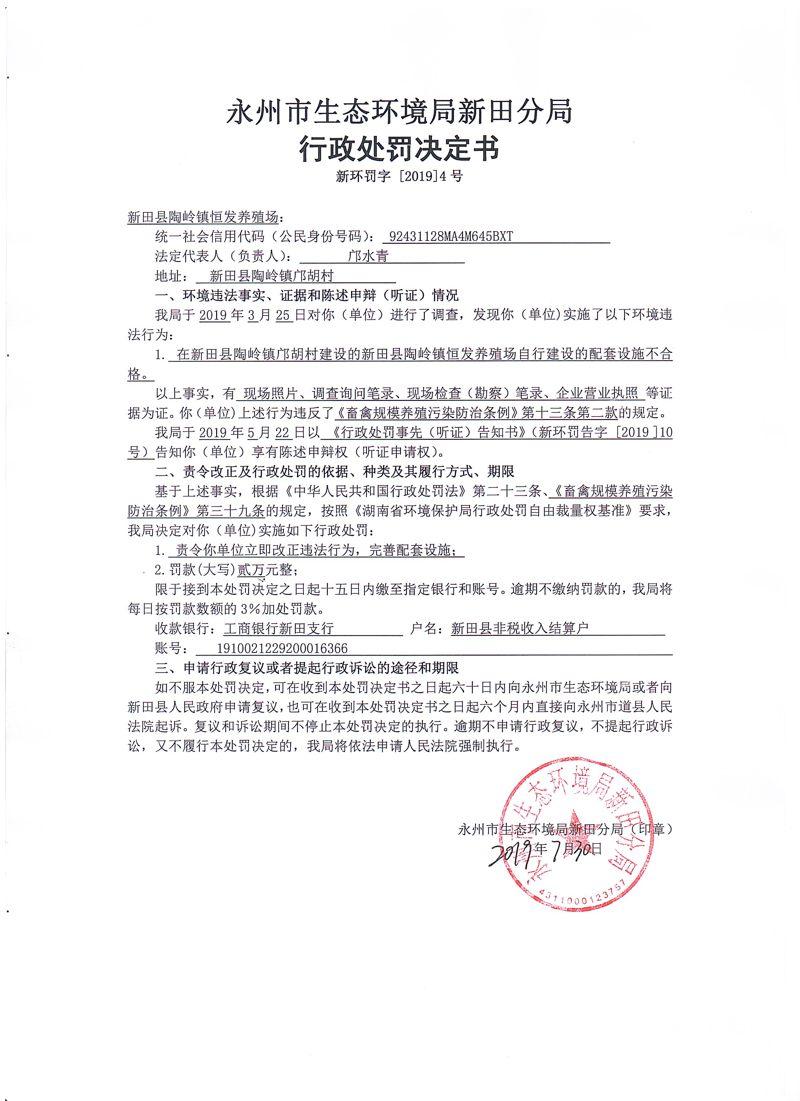 新环罚字【2019】4号关于新田县陶岭镇恒发养殖场行政处罚决定书