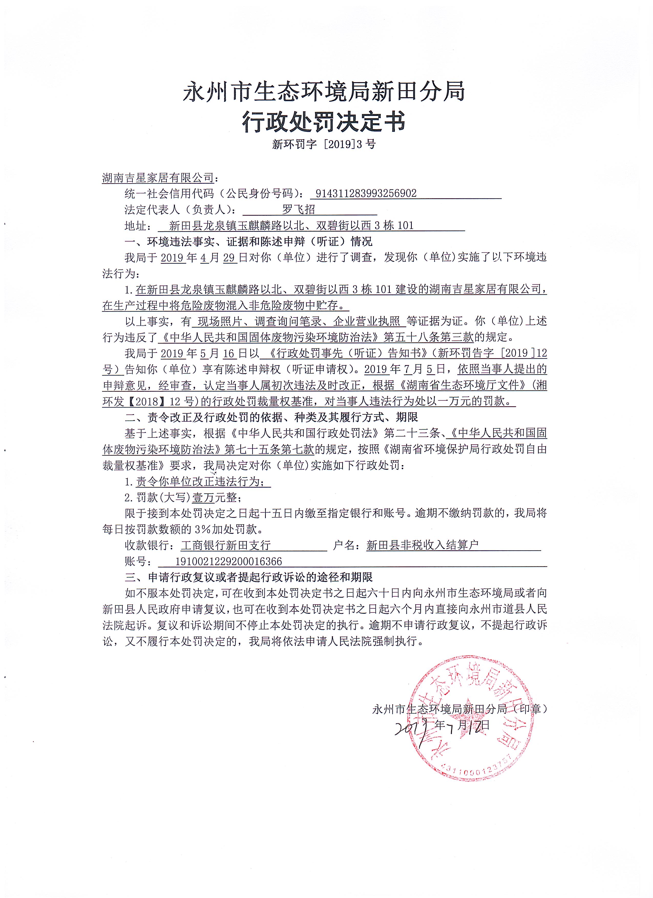 新环罚字【2019】3号关于湖南吉星家居有限公司行政处罚决定书