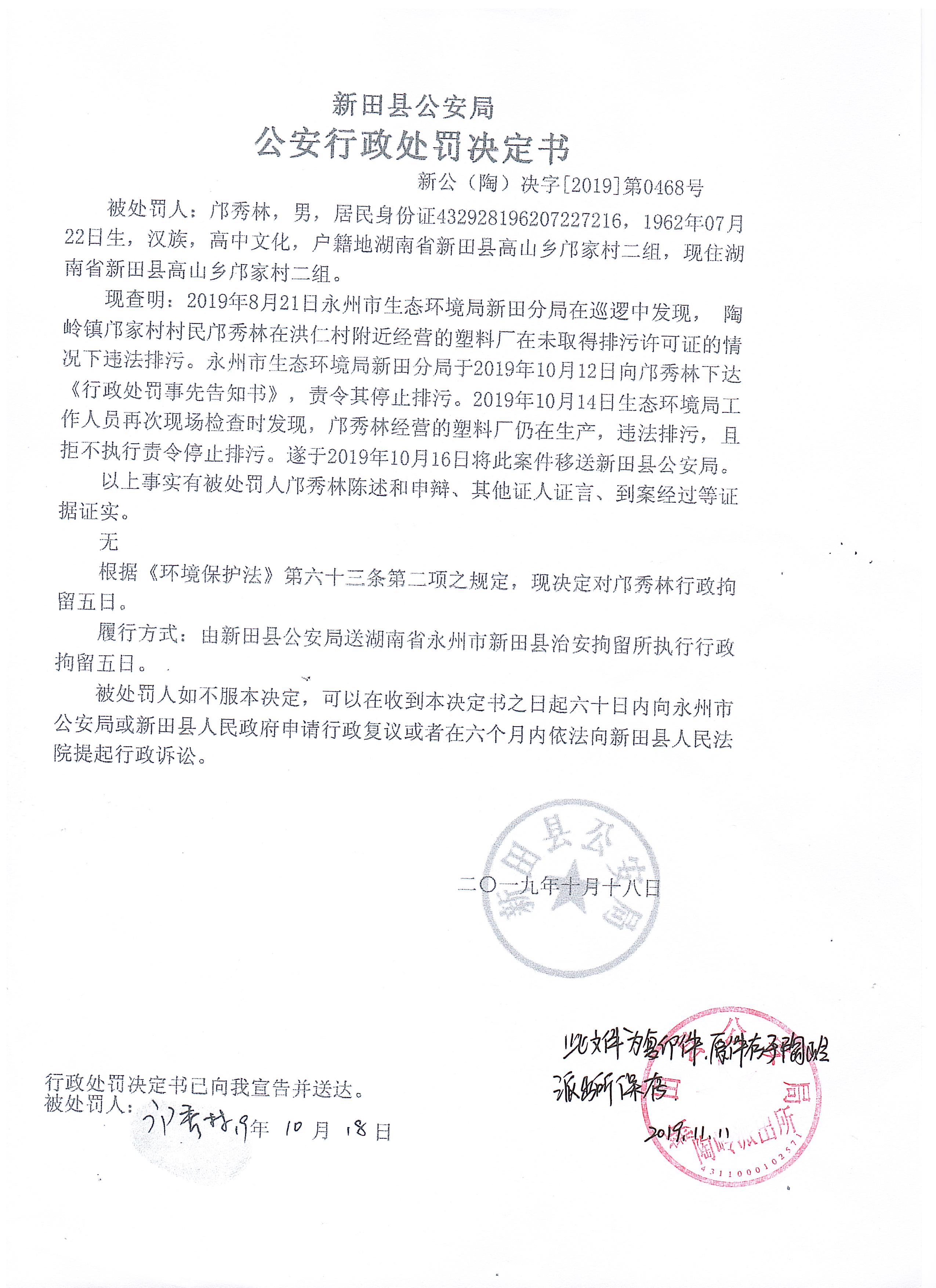 2019年关于陶岭镇邝家村废旧塑料回收非法排污案公安行政处罚决定书