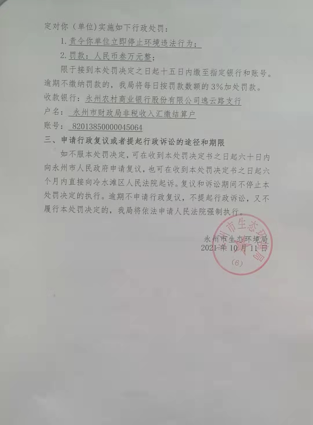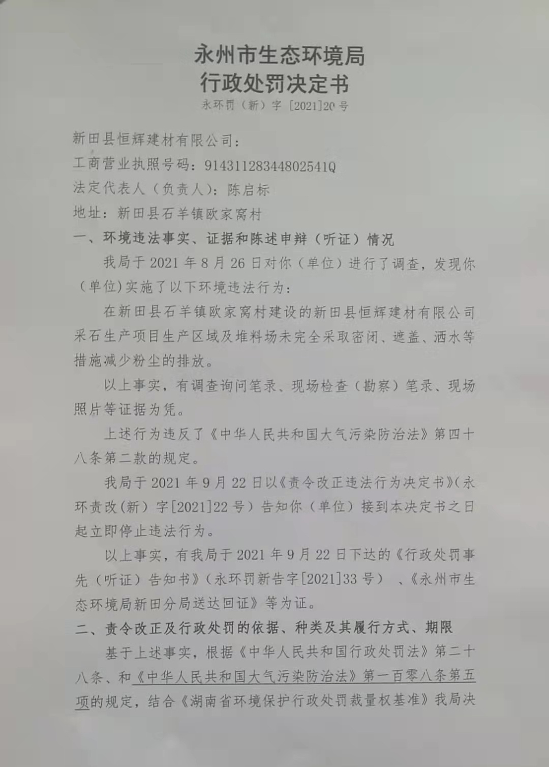 2021年度新田县恒辉建材有限公司采石场未完善污染防治设施行政处罚决定书