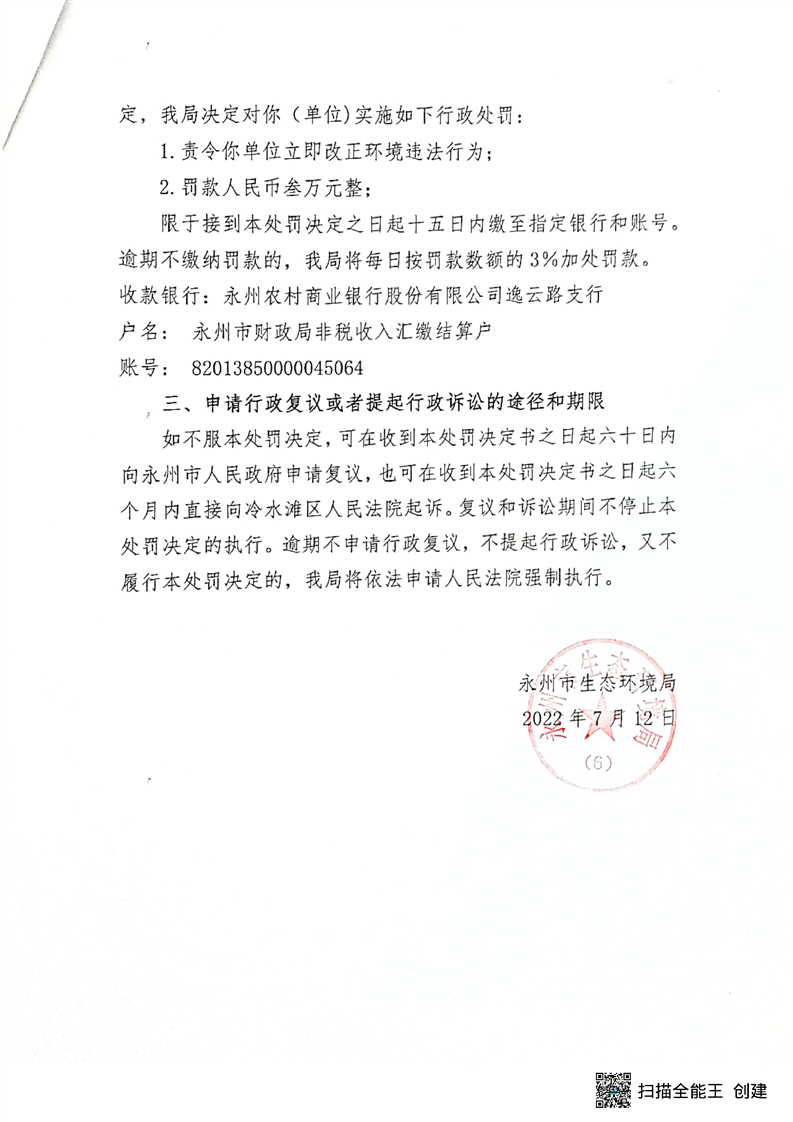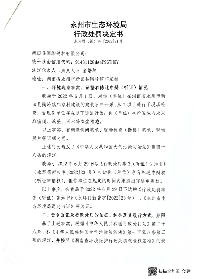 新田县闽湘建材有限公司未完善污染防治设施行政处罚决定书