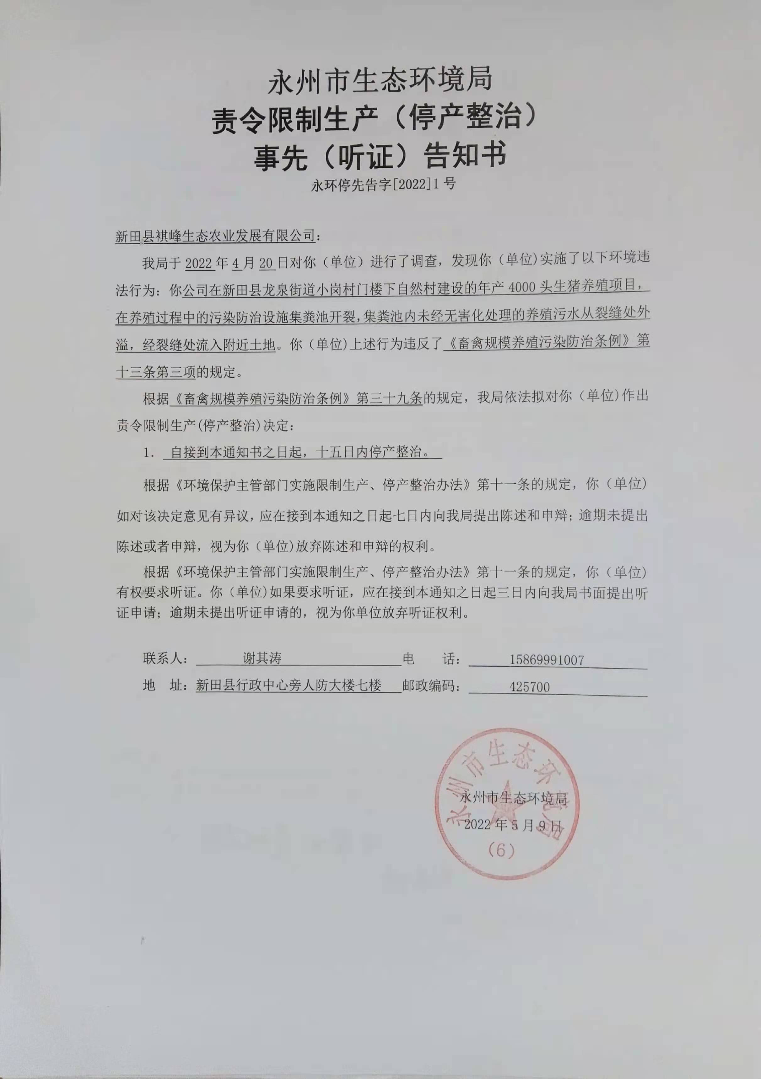 新田县祺峰生态农业发展有限公司停产整治事先告知书