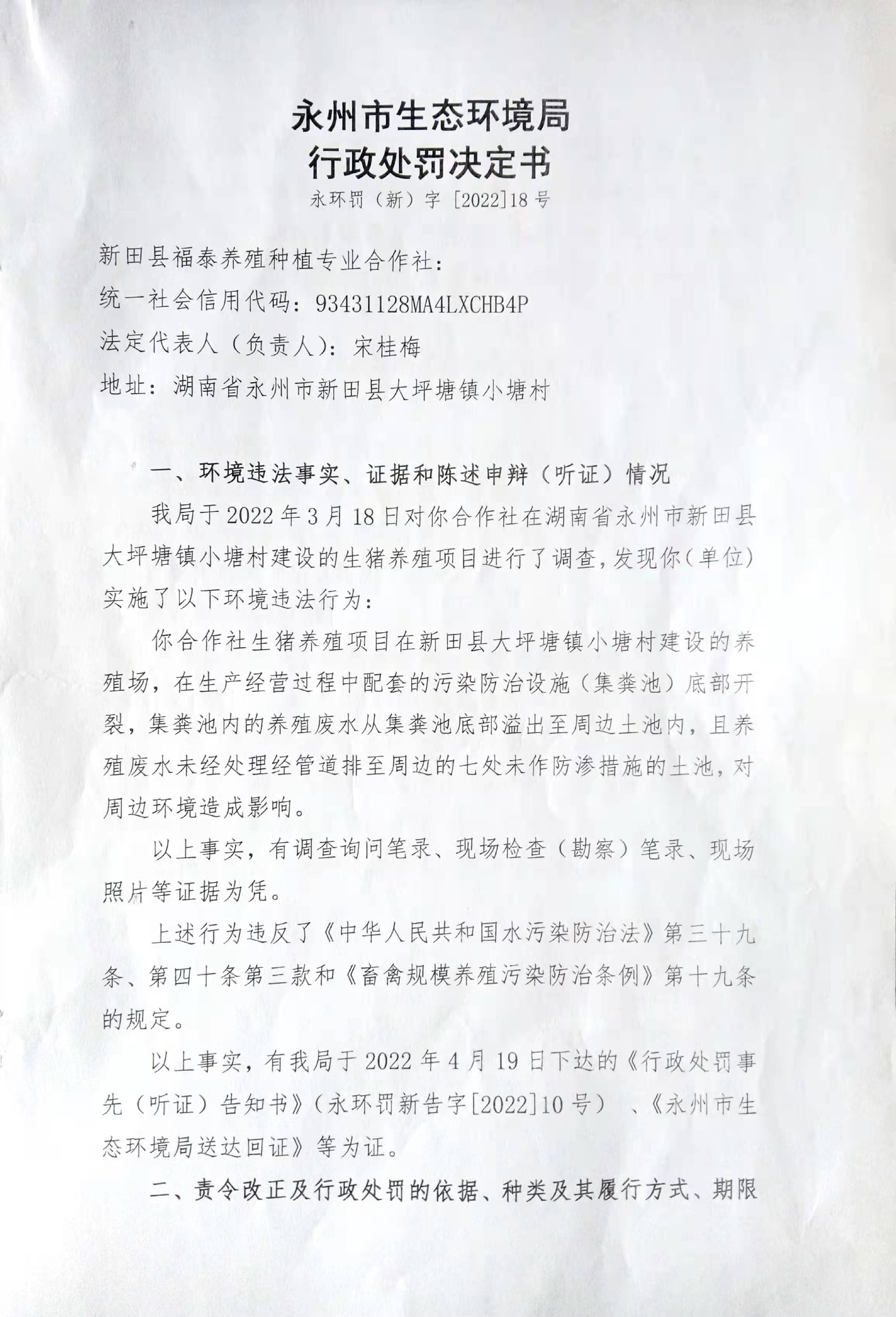 新田县福泰养殖种植专业合作社养殖废水未经处理经管道排至周边未作防渗措施的土池对周边环境造成影响行政处罚决定书