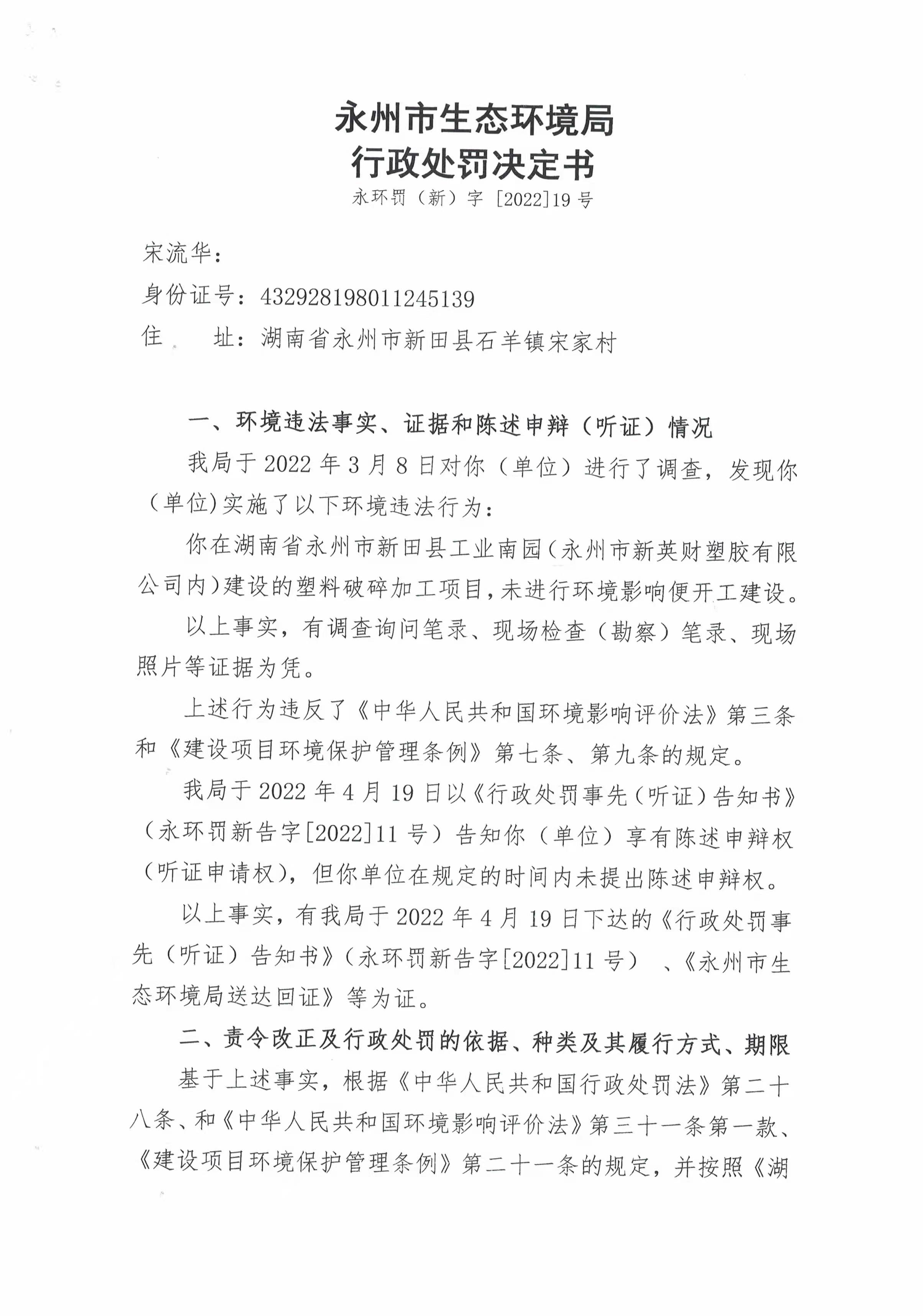 宋流华在工业南园建设的塑料破碎加工项目未进行环境影响评价便开工建设环境违法行为行政处罚决定书