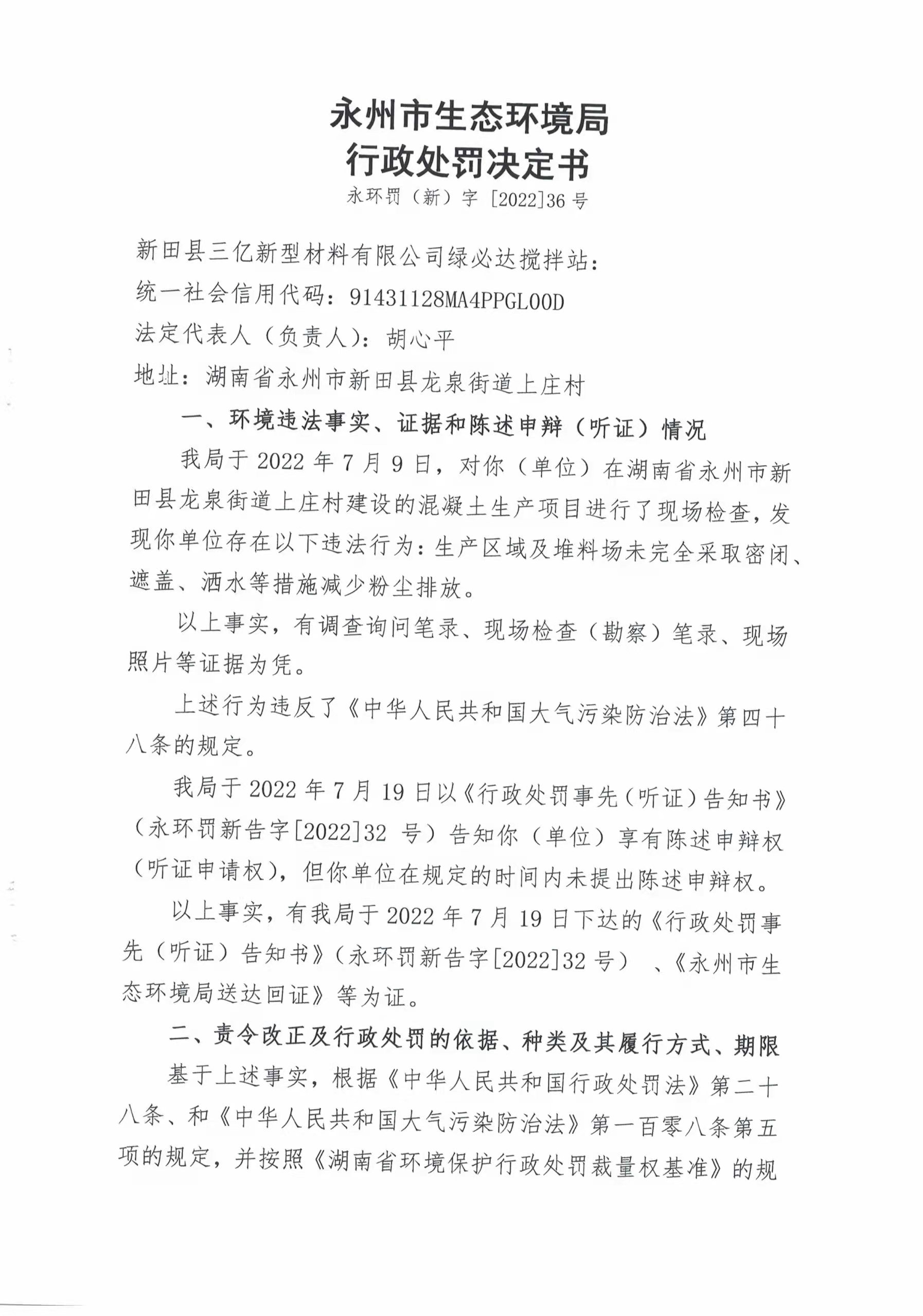 新田县三亿新型材料有限公司绿必达搅拌站生产区域及堆料场未完全采取密闭、遮盖、洒水等措施减少粉尘排放行政处罚决定书