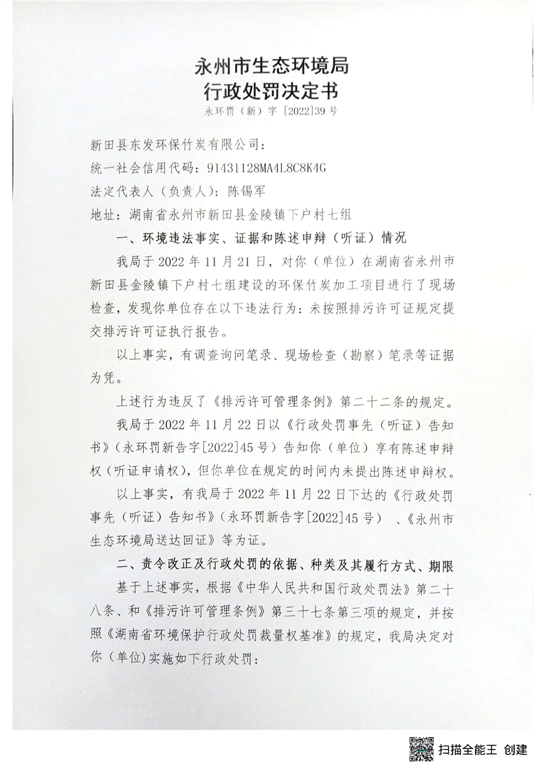 新田县东发环保竹炭有限公司未按照排污许可证规定提交排污许可证执行报告行政处罚决定书